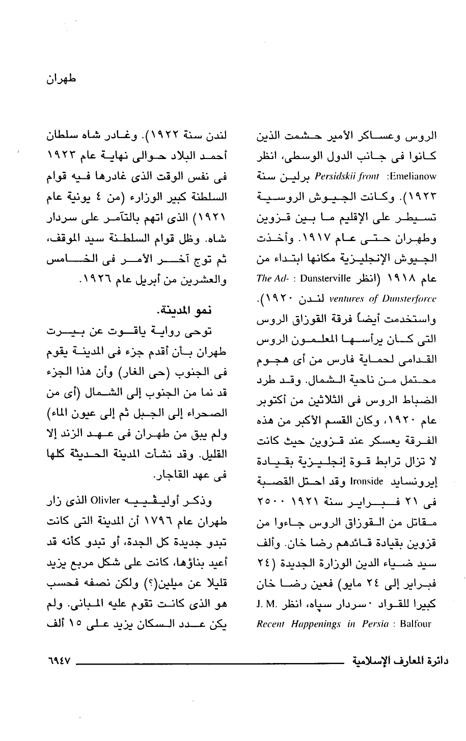 الروس وعساكر الأمير حشمت الذين كانوا فى جانب الدول الوسطى، انظر Persidskii front: Emelianow برلين سنة (1923). وكانت الجيوش الروسية تسيطر على الإقليم ما بين قزوين وطهران حتى عام 1917. وأخذت الجيوش الإنجليزية مكانها ابتداء من عام 1918 (انظر The Adventures of Dunsterforce: Dunsterville لندن 1920). واستخدمت أيضًا فرقة القوزاق الروس التى كان يرأسها المعلمون الروس القدامى لحماية فارس من أى هجوم محتمل من ناحية الشمال. وقد طرد الضباط الروس فى الثلاثين من أكتوبر عام 1920, وكان القسم الأكبر من هذه الفرقة يعسكر عند قزوين حيث كانت لا تزال ترابط قوة إنجليزية بقيادة إيرونسايد Ironside وقد احتل القصبة فى 21 فبراير سنة 1921: 2500 مقاتل من القوزاق الروس جاءوا من قزوين بقيادة قائدهم رضا خان. وألف سيد ضياء الدين الوزارة الجديدة (24 فبراير إلى 24 مايو) فعين رضا خان كبيرا للقواد سردار سباه، انظر Recent Happenings in Persia: J.M.Balfour لندن سنة 1922). وغادر شاه سلطان أحمد البلاد حوالى نهاية عام 1923 فى نفس الوقت الذى غادرها فيه قوام السلطنة كبير الوزارء (من 4 يونية عام 1921) الذى اتهم بالتآمر على سردار شاه. وظل قوام السلطنة سيد الموقف، ثم توج آخر الأمر فى الخامس والعشرين من أبريل عام 1926.