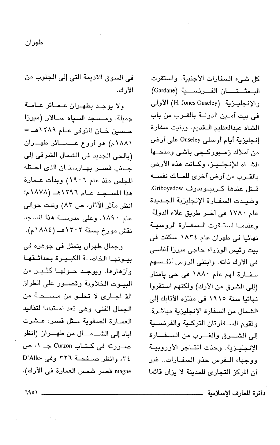 كل شئ السفارات الأجنبية. واستقرت البعثتان الفرنسية (Gardane) والإنجليزية (H. Jones Ouseley) الأولى فى بيت أمين الدولة بالقرب من باب الشاه عبد العظيم القديم. وبنيت سفارة إنجليزية أيام أوسلى Ouseley على أرض من أملاك زمبوركجى باشى ومنحها الشاه للإنجليز، وكانت هذه الأرض بالقرب من أرض أخرى للمالك نفسه قتل عندها كريبويدوف Griboyedow، وشيدت السفارة الإنجليزية الجديدة عام 1870 فى آخر طريق علاء الدولة. وعندما استقرت السفارة الروسية نهائيا فى طهران عام 1834 سكنت فى بيت رئيس الوزراء حاجى ميرزا أغاسى فى الأرك ذاته. وابتنى الروس أنفسهم سفارة لهم عام 1880 فى حى بامنار (إلى الشرق من الأرك) ولكنهم استقروا نهائيا سنة 1915 فى منتزه الأتابك إلى الشمال من السفارة الإنجليزية مباشرة. وتقوم السفارتان التركية والفرنسية إلى الشرق والغرب من السفارة الإنجليزية. وحذت المتاجر الأوربية ووجهاء الفرس حذو السفارات. . غير أن المركز التجارى للمدينة لا يزال قائما فى السوق القديمة التى إلى الجنوب من الأرك.