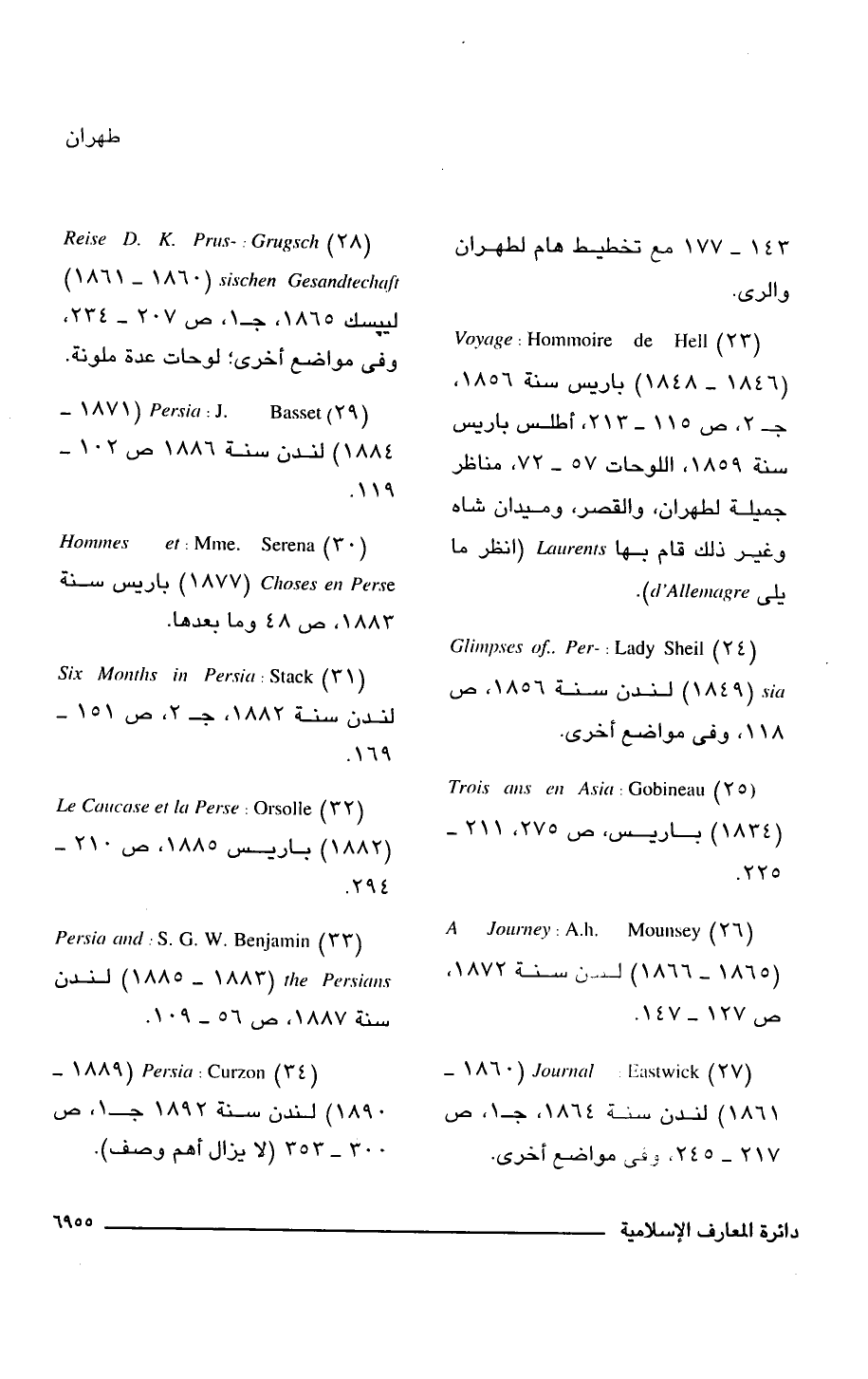 (23) Voyage: Hommoire de Hell (1846 - 1848) باريس سنة 1856، جـ 2، ص 115 - 213, أطلس باريس سنة 1859، اللوحات 57 - 72، مناظر جميلة لطهران، والقصر، وميدان شاه وغير ذلك قام بها Laurents (انظر ما يلى d'Allemagre) .