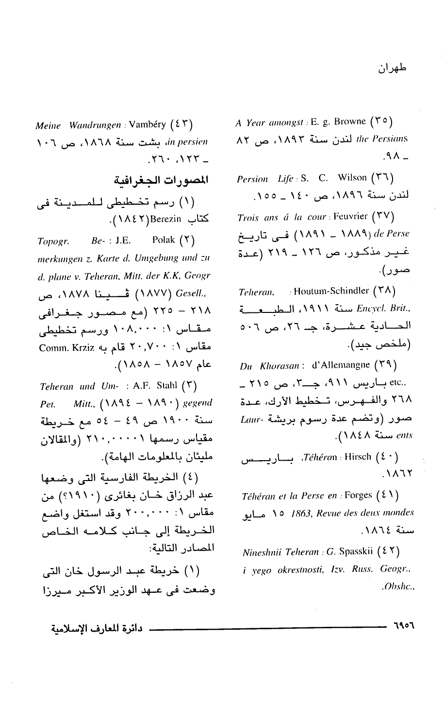 (38) Teheran,Encycl,Brit: Houtum-Schindler، سنة 1911 الطبعة الحادية عشرة، جـ 26، ص 506 (ملخص جيد).