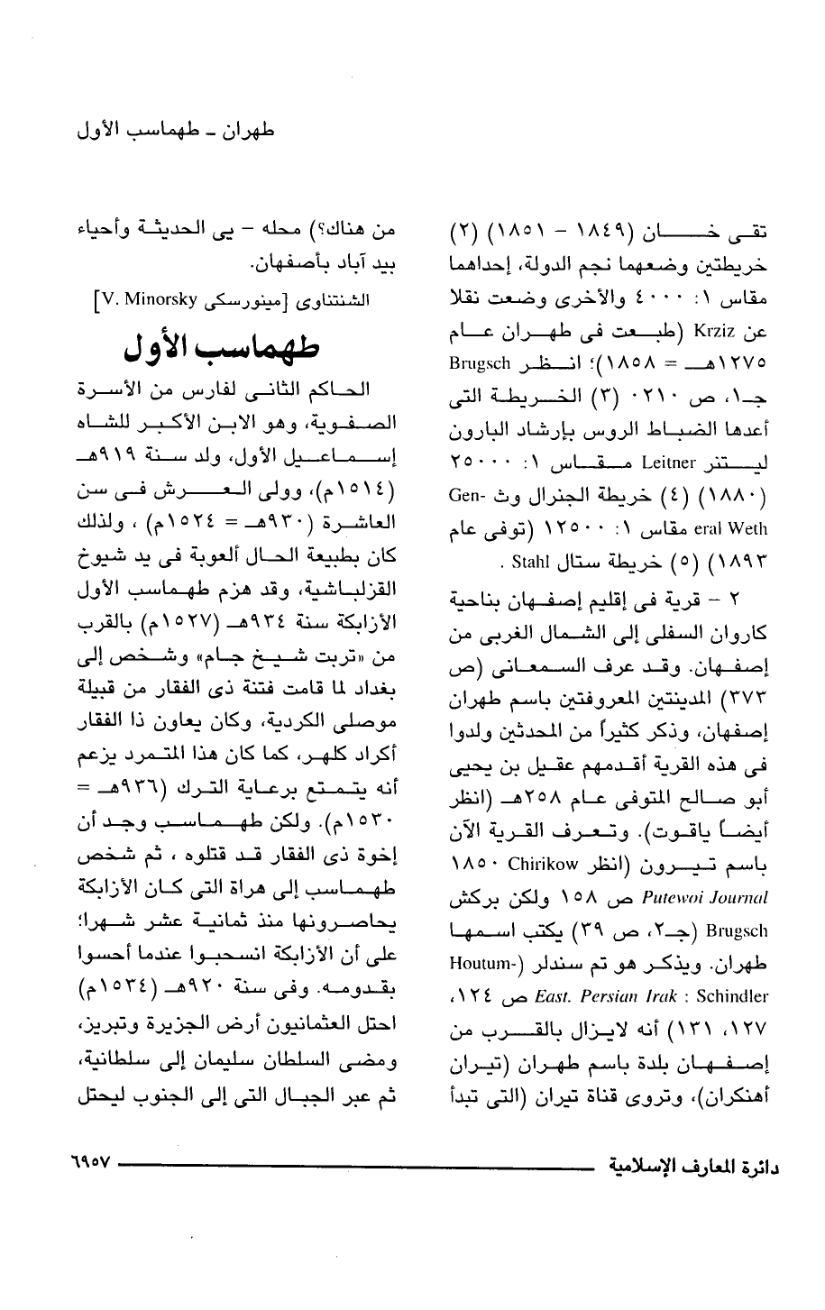 2 - قرية فى إقليم إصفهان بناحية كاروان السفلى إلى الشمال الغربى من إصفهان. وقد عرف السمعانى (ص 373) المدينتين المعروفتين باسم طهران إصفهان، وذكر كثيرًا من المحدثين ولدوا فى هذه القرية أقدمهم عقيل بن يحيى أبو صالح المتوفى عام 258 هـ (انظر أيضًا ياقوت). وتعرف القرية الآن باسم تيرون (انظر Chirikow 1850 Putewoi Journal ص 158 ولكن بركش Bruwsch (جـ 2، ص 39) يكتب اسمها طهران. ويذكر هوتم سندلر (East. Persian Irak: Houtum Schindler ص 124، 127، 131) أنه لا يزال بالقرب من إصفهان بلدة باسم طهران (تيران أهنكران)، وتروى قناة تيران (التى تبدأ من هناك؟ ) محله - يى الحديثة وأحياء بيد آباد بأصفهان.