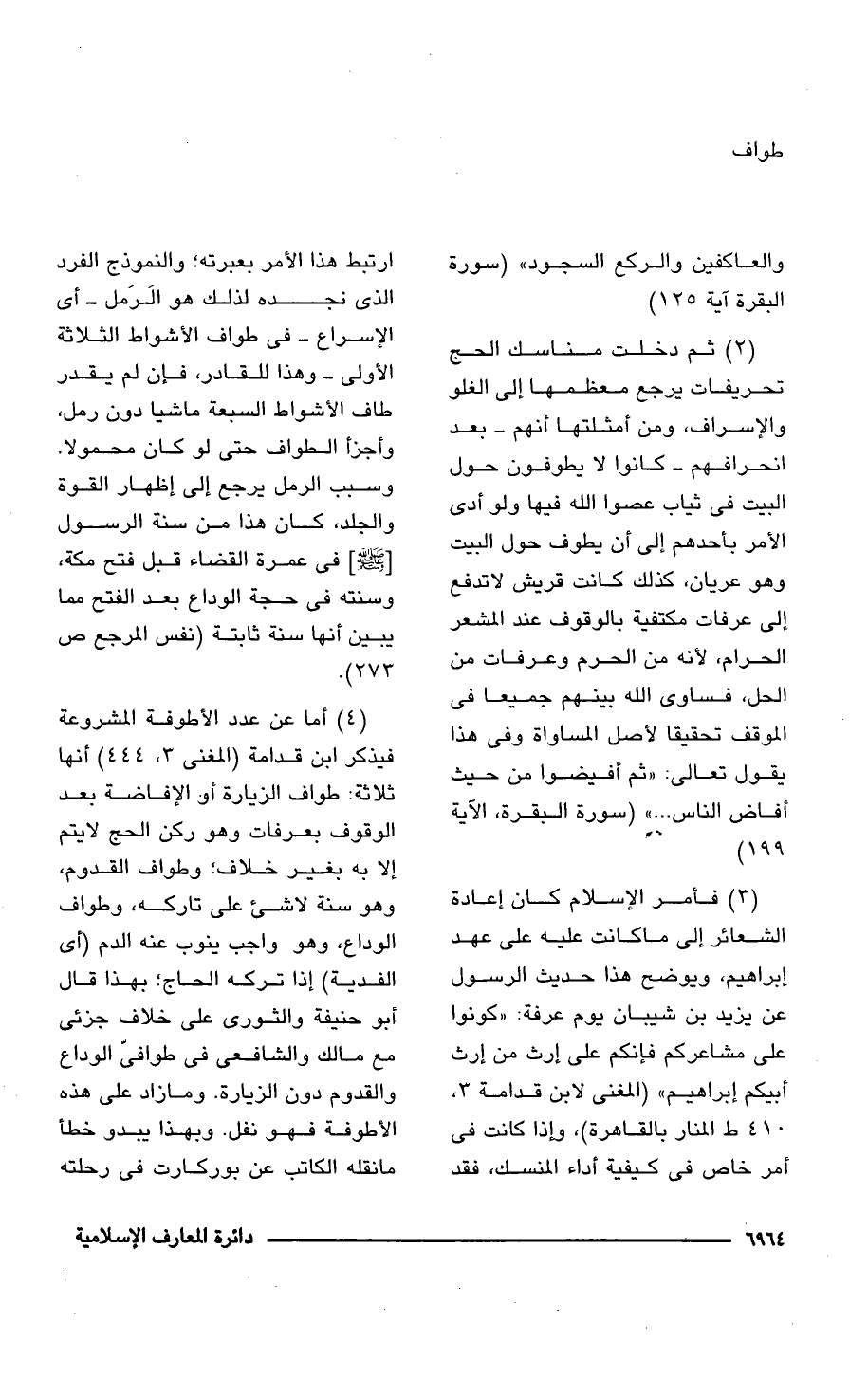 (4) أما عن عدد الأطوفة المشروعة فيذكر ابن قدامة (المغنى 3، 444) أنها ثلاثة: طواف الزيارة أو الإفاضة بعد الوقوف بعرفات وهو ركن الحج لا يتم إلا به بغير خلاف؛ وطواف القدوم، وهو سنة لا شئ على تاركه، وطواف الوداع، وهو واجب ينوب عنه الدم (أى الفدية) إذا تركه الحاج؛ بهذا قال أبو حنيفة والثورى على خلاف جزئى مع مالك والشافعى فى طوافىّ الوداع والقدوم دون الزيارة. وما زاد على هذه الأطوفة فهو نفل. وبهذا يبدو خطأ ما نقله الكاتب عن بوركارت فى رحلته
