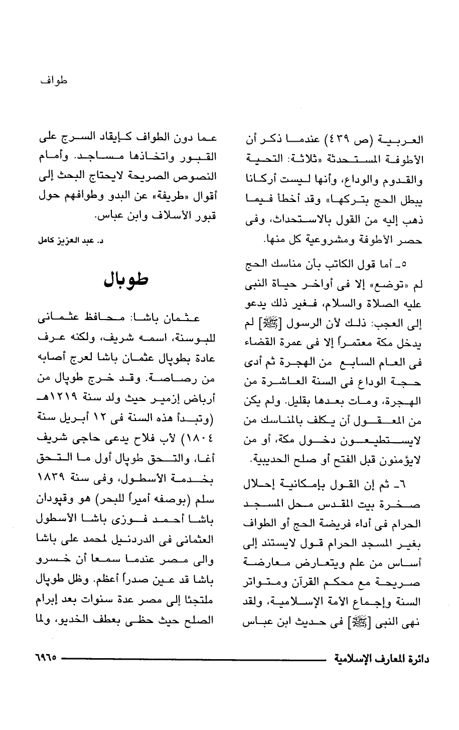 العربية (ص 439) عندما ذكر أن الأطوفة المستحدثة "ثلاثة: التحية والقدوم والوداع، وأنها ليست أركانا يبطل الحج بتركها" وقد أخطأ فيما ذهب إليه من القول بالاستحداث، وفى حصر الأطوفة ومشروعية كل منها.