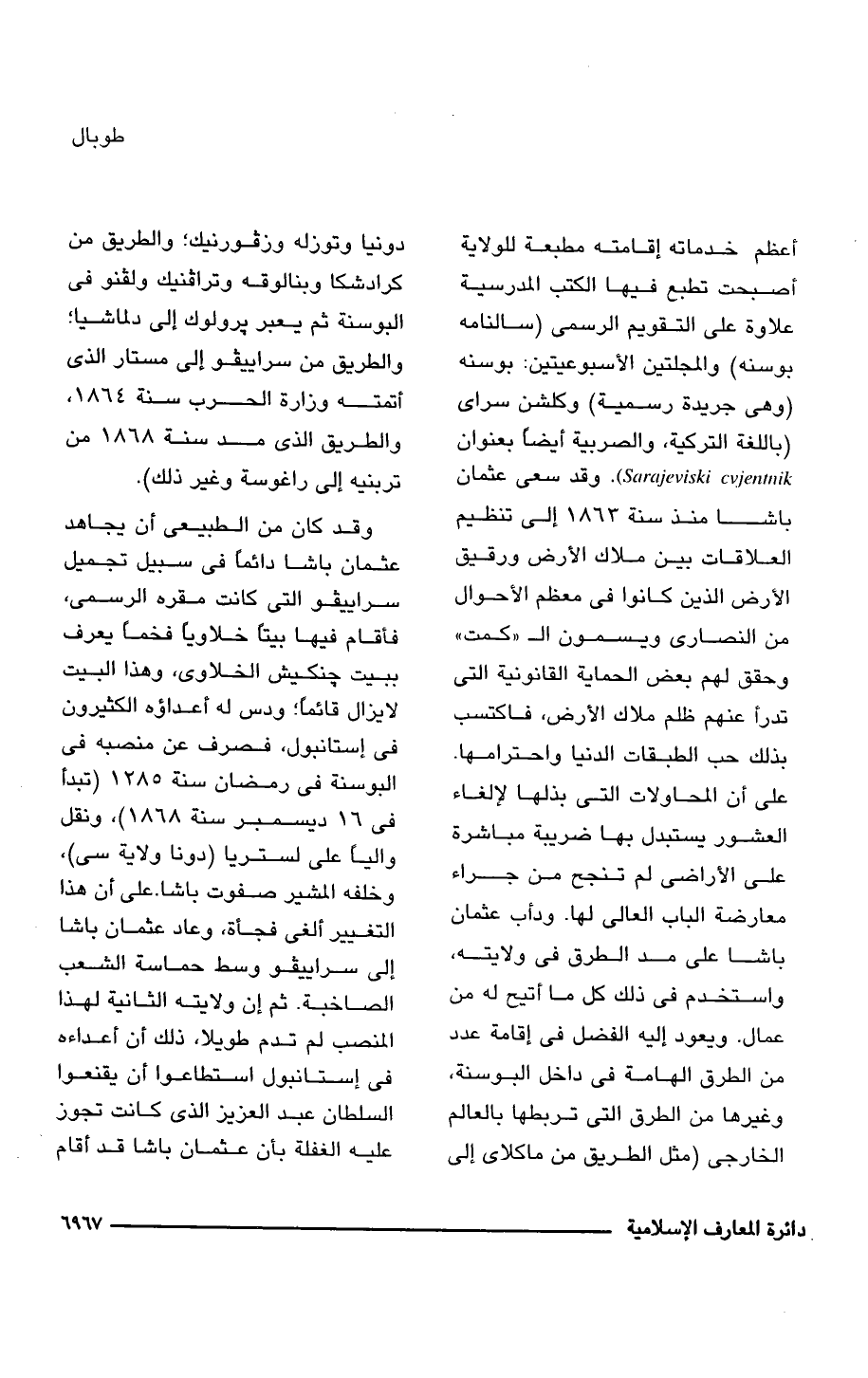 أعظم خدماته إقامته مطبعة للولاية أصبحت تطبع فيها الكتب المدرسية علاوة على التقويم الرسمى (سالنامه بوسنه) والمجلتين الأسبوعيتين: بوسنه (وهى جريدة رسمية) وكلشن سراى (باللغة التركية، والصربية أيضًا بعنوان Sarajeviski cvjentnik). وقد سعى عثمان باشا منذ سنة 1863 إلى تنظيم العلاقات بين ملاك الأرض ورقيق الأرض الذين كانوا فى معظم الأحوال من النصارى ويسمون الـ"كمت" وحقق لهم بعض الحماية القانونية التى تدرأ عنهم ظلم ملاك الأرض، فاكتسب بذلك حب الطبقات الدنيا واحترامها. على أن المحاولات التى بذلها لإلغاء العشور يستبدل بها ضريبة مباشرة على الأراضى لم تنجح من جراء معارضة الباب العالى لها. ودأب عثمان باشا على مد الطرق فى ولايته، واستخدم فى ذلك كل ما أتيح له من عمال. ويعود إليه الفضل فى إقامة عدد من الطرق الهامة فى داخل البوسنة، وغيرها من الطرق التى تربطها بالعالم الخارجى (مثل الطريق من ماكلاى إلى دونيا وتوزله وزفورنيك؛ والطريق من كرادشكا وبنالوقه وترافنيك ولفنو فى البوسنة ثم يعبر برولوك إلى دلماشيا؛ والطريق من سراييفو إلى مستار الذى أتمته وزارة الحرب سنة 1864, والطريق الذى مد سنة 1868 من تربنيه إلى راغوسة وغير ذلك).