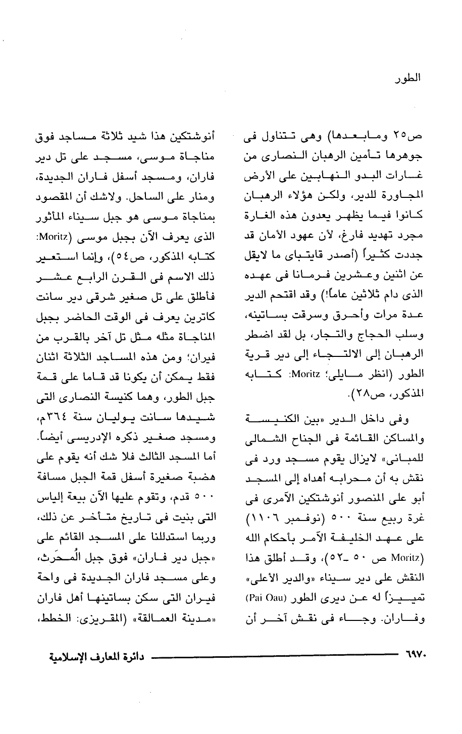 وفى داخل الدير "بين الكنيسة والمساكن القائمة فى الجناح الشمالى للمبانى" لا يزال يقوم مسجد ورد فى نقش به أن محرابه أهداه إلى المسجد أبو على المنصور أنوشتكين الآمرى فى غرة ربيع سنة 500 (نوفمبر 1106) على عهد الخليفة الآمر بأحكام اللَّه (Moritz ص 50 - 52)، وقد أطلق هذا النقش على دير سيناء "والدير الأعلى" تمييزًا له عن ديرى الطور (Pai Oau) وفاران. وجاء فى نقش آخر أن أنوشتكين هذا شيد ثلاثة مساجد فوق مناجاة موسى، مسجد على تل دير فاران، ومسجد أسفل فاران الجديدة، ومنار على الساحل. ولا شك أن المقصود بمناجاة موسى هو جبل سيناء المأثور الذى يعرف الآن بجبل موسى (Mnritz: كتابه المذكور، ص 54)، وإنما استعير ذلك الاسم فى القرن الرابع عشر فأطلق على تل صغير شرقى دير سانت كاترين يعرف فى الوقت الحاضر بجبل المناجاة مثله مثل تل آخر بالقرب من فيران؛ ومن هذه المساجد الثلاثة اثنان فقط يمكن أن يكونا قد قاما على قمة جبل الطور، وهما كنيسة النصارى التى شيدها سانت يوليان سنة 364 م، ومسجد صغير ذكره الإدريسى أيضًا. أما المسجد الثالث فلا شك أنه يقوم على هضبة صغيرة أسفل قمة الجبل مسافة 500 قدم، وتقوم عليها الآن بيعة إلياس التى بنيت فى تاريخ متأخر عن ذلك، وربما استدللنا على المسجد القائم على "جبل دير فاران" فوق جبل المُحَرث، وعلى مسجد فاران الجديدة فى واحة فيران التى سكن بساتينها أهل فاران "مدينة العمالقة" (المقريزى: الخطط،