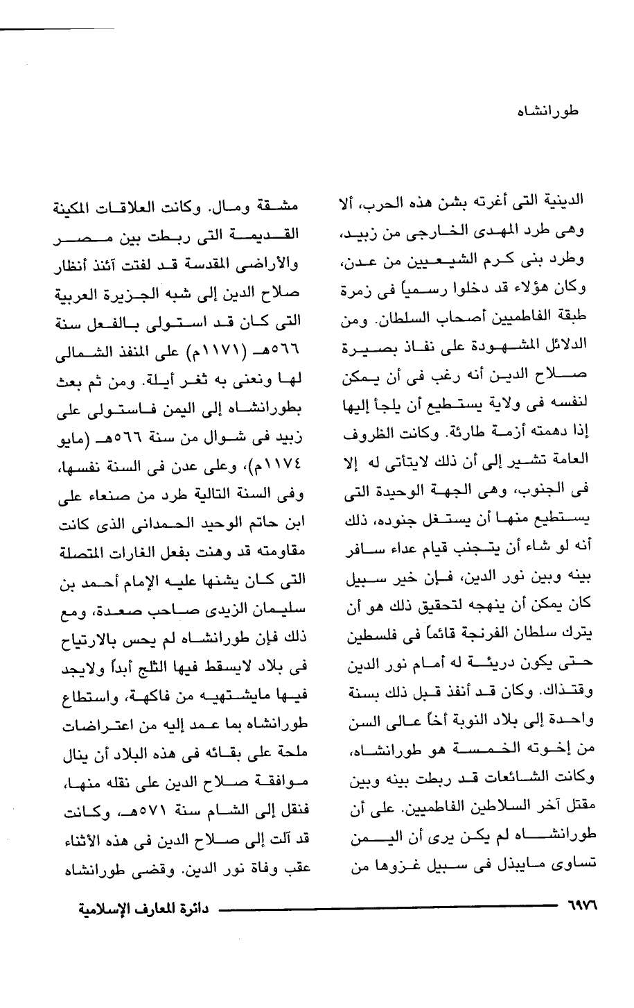 الدينية التى أغرته بشن هذه الحرب، ألا وهى طرد المهدى الخارجى من زبيد، وطرد بنى كرم الشيعيين من عدن، وكان هؤلاء قد دخلوا رسميًا فى زمرة طبقة الفاطميين أصحاب السلطان. ومن الدلائل المشهودة على نفاذ بصيرة صلاح الدين أنه رغب فى أن يمكن لنفسه فى ولاية يستطيع أن يلجأ إليها إذا دهمته أزمة طارئة. وكانت الظروف العامة تشير إلى أن ذلك لا يتأتى له إلا فى الجنوب، وهى الجهة الوحيدة التى يستطيع منها أن يستغل جنوده، ذلك أنه لو شاء أن يتجنب قيام عداء سافر بينه وبين نور الدين، فإن خير سبيل كان يمكن أن ينهجه لتحقيق ذلك هو أن يترك سلطان الفرنجة قائمًا فى فلسطين حتى يكون دريئة له أمام نور الدين وقتذاك. وكان قد أنفذ قبل ذلك بسنة واحدة إلى بلاد النوبة أخًا عالى السن من إخوته الخمسة هو طورانشاه، وكانت الشائعات قد ربطت بينه وبين مقتل آخر السلاطين الفاطميين. على أن طورانشاه لم يكن يرى أن اليمن تساوى ما يبذل فى سبيل غزوها من مشقة ومال. وكانت العلاقات المكينة القديمة التى ربطت بين مصر والأراضى المقدسة قد لفتت آئنذ أنظار صلاح الدين إلى شبه الجزيرة العربية التى كان قد استولى بالفعل سنة 566 هـ (1171 م) على المنفذ الشمالى لها ونعنى به ثغر أيلة. ومن ثم بعث بطورانشاه إلى اليمن فاستولى على زبيد فى شوال من سنة 566 هـ (مايو 1174 م)، وعلى عدن فى السنة نفسها، وفى السنة التالية طرد من صنعاء على ابن حاتم الوحيد الحمدانى الذى كانت مقاومته قد وهنت بفعل الغارات المتصلة التى كان يشنها عليه الإمام أحمد بن سليمان الزيدى صاحب صعدة، ومع ذلك فإن طورانشاه لم يحس بالارتياح فى بلاد لا يسقط فيها الثلج أبدًا ولا يجد فيها ما يشتهيه من فاكهة، واستطاع طورانشاه بما عمد إليه من اعتراضات ملحة على بقائه فى هذه البلاد أن ينال موافقة صلاح الدين على نقله منها، فنقل إلى الشام سنة 571 هـ، وكانت قد آلت إلى صلاح الدين فى هذه الأثناء عقب وفاة نور الدين. وقضى طورانشاه