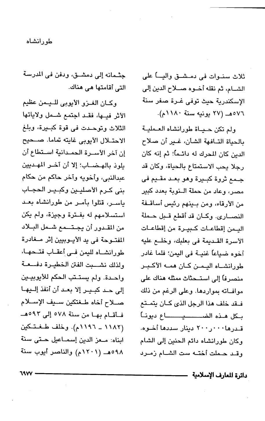 ولم تكن حياة طورانشاه العملية بالحياة التافهة الشأن، غير أن صلاح الدين كان المحرك له دائمًا؛ ثم إنه كان رجلا يحب الاستمتاع بالحياة، وكان قد جمع ثروة كبيرة وهو بعد مقيم فى مصر، وعاد من حملة النوبة بعدد كبير من الأرقاء، ومن بينهم رئيس أساقفة النصارى. وكان قد أقطع قبل حملة اليمن إقطاعات كبيرة من إقطاعات الأسرة القديمة فى بعلبك، وخلع عليه أخوه ضياعا غنية فى اليمن؛ فلما غادر طورانشاه اليمن كان همه الأكبر منصرفًا إلى استحثاث ممثله هناك على موافاته بمواردها. وعلى الرغم من ذلك فقد خلف هذا الرجل الذى كان يتمتع بكل هذه الضياع ديونًا قدرها 200.000 دينار سددها أخوه. وكان طورانشاه دائم الحنين إلى الشام وقد حملت أخته ست الشام زمرد جثمانه إلى دمشق، ودفن فى المدرسة التى أقامتها هى هناك.
