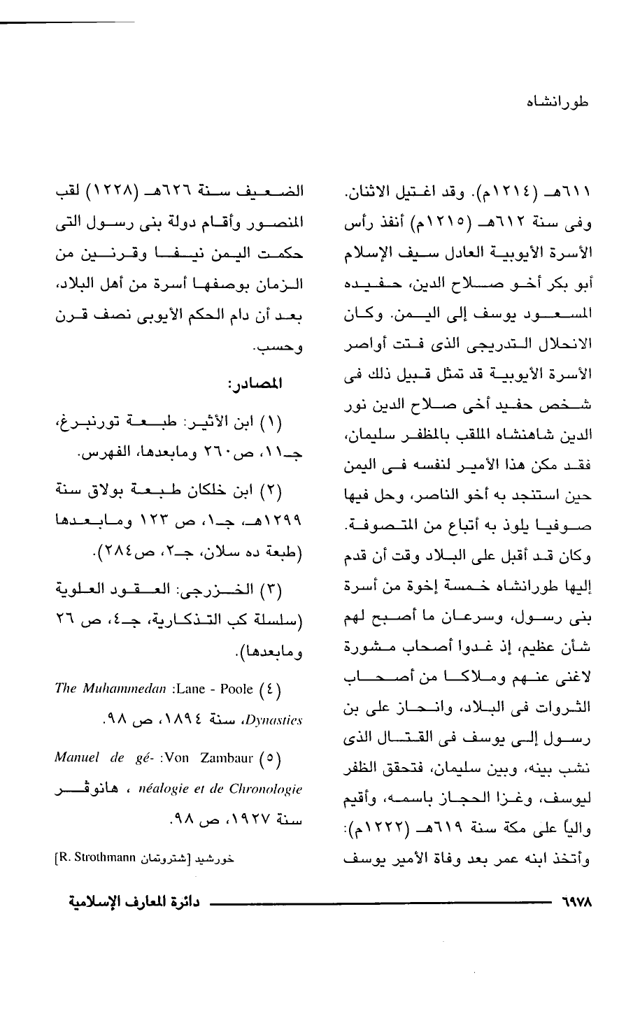 611 هـ (1214 م). وقد اغتيل الاثنان. وفى سنة 612 هـ (1215 م) أنفذ رأس الأسرة الأيوبية العادل سيف الإسلام أبو بكر أخو صلاح الدين، حفيده المسعود يوسف إلى اليمن. وكان الانحلال التدريجى الذى فتت أواصر الأسرة الأيوبية قد تمثل قبيل ذلك فى شخص حفيد أخى صلاح الدين نور الدين شاهنشاه الملقب بالمظفر سليمان، فقد مكن هذا الأمير لنفسه فى اليمن حين استنجد به أخو الناصر، وحل فيها صوفيا يلوذ به أتباع من المتصوفة. وكان قد أقبل على البلاد وقت أن قدم إليها طورانشاه خمسة إخوة من أسرة بنى رسول، وسرعان ما أصبح لهم شأن عظيم، إذ غدوا أصحاب مشورة لا غنى عنهم وملاكا من أصحاب الثروات فى البلاد، وانحاز على بن رسول إلى يوسف فى القتال الذى نشب بينه، وبين سليمان، فتحقق الظفر ليوسف، وغزا الحجاز باسمه، وأقيم واليًا على مكة سنة 619 هـ (1222 م): وأتخذ ابنه عمر بعد وفاة الأمير يوسف الضعيف سنة 626 هـ (1228 م) لقب المنصور وأقام دولة بنى رسول التى حكمت اليمن نيفا وقرنين من الزمان بوصفها أسرة من أهل البلاد، بعد أن دام الحكم الأيوبى نصف قرن وحسب.