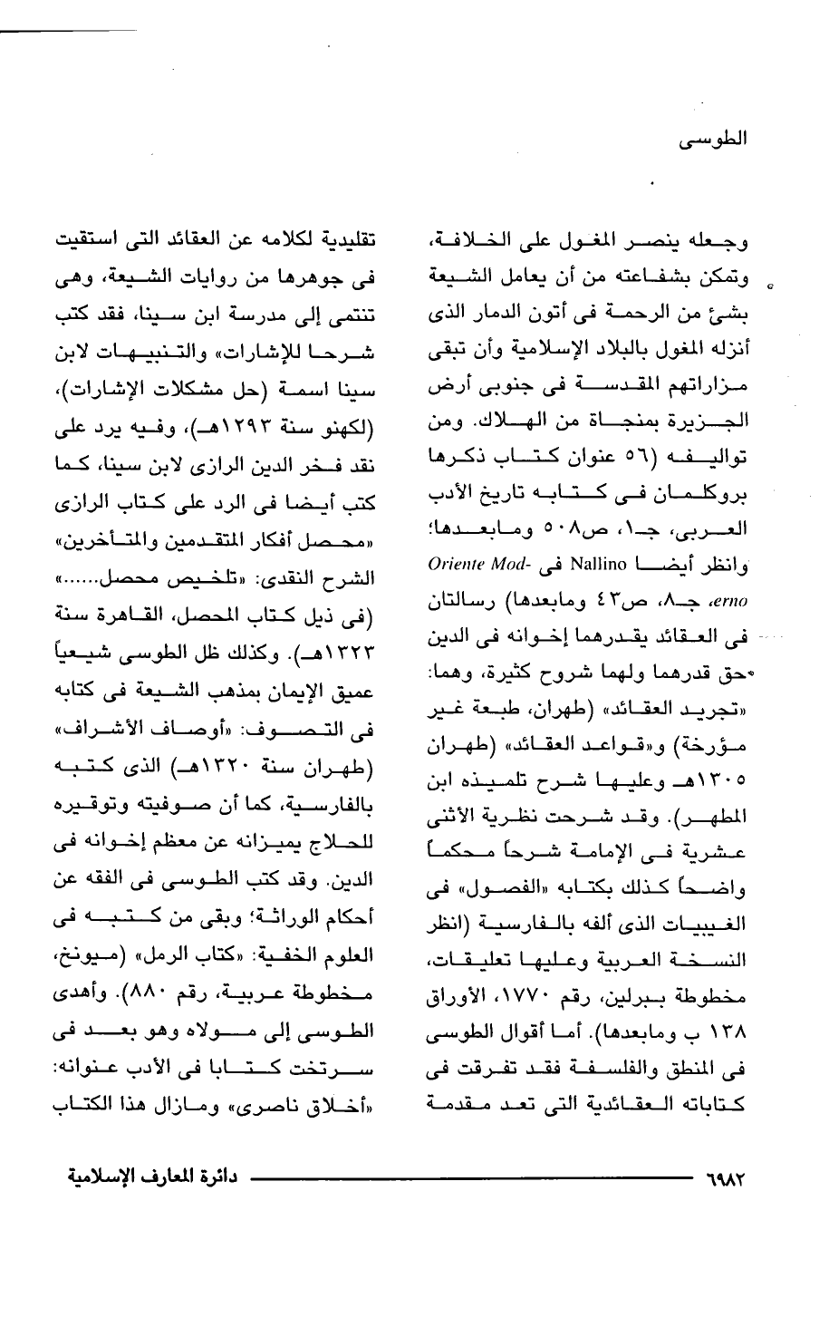 وجعله ينصر المغول على الخلافة، وتمكن بشفاعته من أن يعامل الشيعة بشئ من الرحمة فى أتون الدمار الذى أنزله المغول بالبلاد الإسلامية وأن تبقى مزاراتهم المقدسة فى جنوبى أرض الجزيرة بمنجاة من الهلاك. ومن تواليفه (56 عنوان كتاب ذكرها بروكلمان فى كتابه تاريخ الأدب العربى، جـ 1، ص 508 وما بعدها؛ وانظر أيضا Nallino فى Oriente Moderno، جـ 8، ص 43 وما بعدها) رسالتان فى العقائد يقدرهما إخوانه فى الدين حق قدرهما ولهما شروح كثيرة، وهما: "تجريد العقائد" (طهران، طبعة غير مؤرخة) و"قواعد العقائد" (طهران 1305 هـ وعليها شرح تلميذه ابن المطهر). وقد شرحت نظرية الأثنى عشرية فى الإمامة شرحًا محكمًا واضحًا كذلك بكتابه "الفصول" فى الغيبيات الذى ألفه بالفارسية (انظر النسخة العربية وعليها تعليقات، مخطوطة ببرلين، رقم 1770، الأوراق 138 ب وما بعدها). أما أقوال الطوسى فى المنطق والفلسفة فقد تفرقت فى كتاباته العقائدية التى تعد مقدمة تقليدية لكلامه عن العقائد التى استقيت فى جوهرها من روايات الشيعة، وهى تنتمى إلى مدرسة ابن سينا، فقد كتب شرحا للإشارات" والتنبيهات لابن سينا اسمة (حل مشكلات الإشارات)، (لكهنو سنة 1293 هـ)، وفيه يرد على نقد فخر الدين الرازى لابن سينا، كما كتب أيضا فى الرد على كتاب الرازى "محصل أفكار المتقدمين والمتأخرين" الشرح النقدى: "تلخيص محصل. . . " (فى ذيل كتاب المحصل، القاهرة سنة 1323 هـ). وكذلك ظل الطوسى شيعيًا عميق الإيمان بمذهب الشيعة فى كتابه فى التصوف: "أوصاف الأشراف" (طهران سنة 1320 هـ) الذى كتبه بالفارسية، كما أن صوفيته وتوقيره للحلاج يميزانه عن معظم إخوانه فى الدين. وقد كتب الطوسى فى الفقه عن أحكام الوراثة؛ وبقى من كتبه فى العلوم الخفية: "كتاب الرمل" (ميونخ، مخطوطة عربية، رقم 880). وأهدى الطوسى إلى مولاه وهو بعد فى سرتخت كتابا فى الأدب عنوانه: "أخلاق ناصرى" وما زال هذا الكتاب