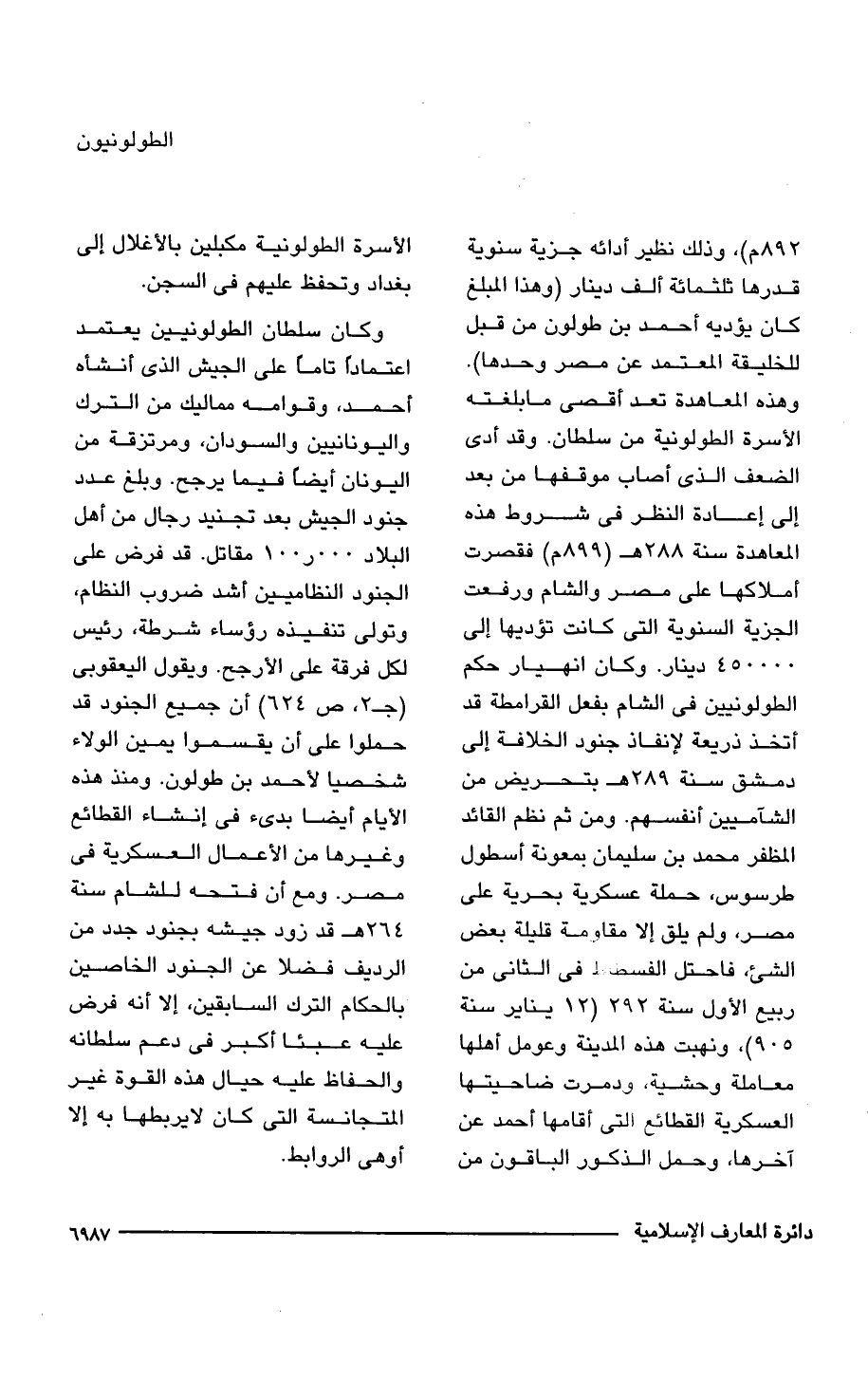 892 م)، وذلك نظير أدائه جزية سنوية قدرها ثلثمائة ألف دينار (وهذا المبلغ كان يؤديه أحمد بن طولون من قبل للخليقة المعتمد عن مصر وحدها). وهذه المعاهدة تعد أقصى ما بلغته الأسرة الطولونية من سلطان. وقد أدى الضعف الذى أصاب موقفها من بعد إلى إعادة النظر فى شروط هذه المعاهدة سنة 228 هـ (899 م) فقصرت أملاكها على مصر والشام ورفعت الجزية السنوية التى كانت تؤديها إلى 450000 دينار. وكان انهيار حكم الطولونيين فى الشام بفعل القرامطة قد أتخذ ذريعة لإنفاذ جنود الخلافة إلى دمشق سنة 289 هـ بتحريض من الشآميين أنفسهم. ومن ثم نظم القائد المظفر محمد بن سليمان بمعونة أسطول طرسوس، حملة عسكرية بحرية على مصر، ولم يلق إلا مقاومة قليلة بعض الشئ، فاحتل الفسطاط فى الثانى من ربيع الأول سنة 292 (12 يناير سنة 905)، ونهبت هذه المدينة وعومل أهلها معاملة وحشية، ودمرت ضاحيتها العسكرية القطائع التى أقامها أحمد عن آخرها، وحمل الذكور الباقون من الأسرة الطولونية مكبلين بالأغلال إلى بغداد وتحفظ عليهم فى السجن.