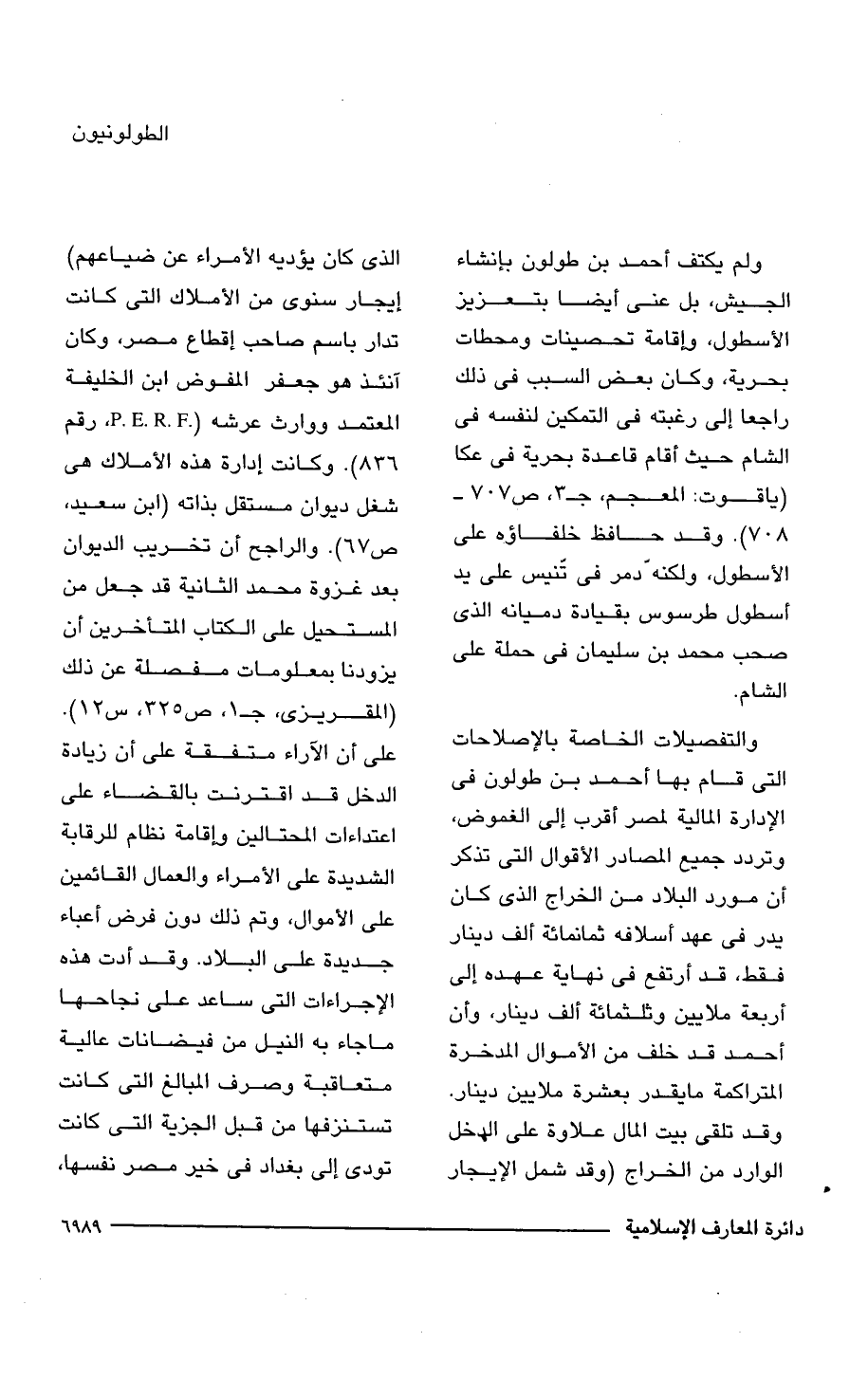 والتفصيلات الخاصة بالإصلاحات التى قام بها أحمد بن طولون فى الإدارة المالية لمصر أقرب إلى الغموض، وتردد جميع المصادر الأقوال التى تذكر أن مورد البلاد من الخراج الذى كان يدر فى عهد أسلافه ثمانمائة ألف دينار فقط، قد أرتفع فى نهاية عهده إلى أربعة ملايين وثلثمائة ألف دينار، وأن أحمد قد خلف من الأموال المدخرة المتراكمة ما يقدر بعشرة ملايين دينار. وقد تلقى بيت المال علاوة على الدخل الوارد من الخراج (وقد شمل الإيجار الذى كان يؤديه الأمراء عن ضياعهم) إيجار سنوى من الأملاك التى كانت تدار باسم صاحب إقطاع مصر، وكان آنئذ هو جعفر المفوض ابن الخليفة المعتمد ووارث عرشه (P.E.R.F, رقم 836). وكانت إدارة هذه الأملاك هى شغل ديوان مستقل بذاته (ابن سعيد، ص 67). والراجح أن تخريب الديوان بعد غزوة محمد الثانية قد جعل من المستحيل على الكتاب المتأخرين أن يزودنا بمعلومات مفصلة عن ذلك (المقريزى، جـ 1، ص 325 , س 12). على أن الآراء متفقة على أن زيادة الدخل قد اقترنت بالقضاء على اعتداءات المحتالين وإقامة نظام للرقابة الشديدة على الأمراء والعمال القائمين على الأموال، وتم ذلك دون فرض أعباء جديدة على البلاد. وقد أدت هذه الإجراءات التى ساعد على نجاحها ما جاء به النيل من فيضانات عالية متعاقبة وصرف المبالغ التى كانت تستنزفها من قبل الجزية التى كانت تودى إلى بغداد فى خير مصر نفسها،