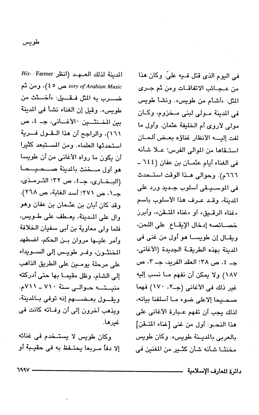 فى اليوم الذى قتل فيه علىّ. وكان هذا من عجائب الاتفاقات ومن ثم جرى المثل: "أشأم من طويس". ونشأ طويس فى المدينة مولى لبنى مخزوم، وكان مولى لأروى أم الخليفة عثمان. وأول ما لفت إليه الأنظار غناؤه بعض ألحان استقاها من الموالى الفرس؛ علا شأنه فى الغناء أيام عثمان بن عفان (644 - 666 م). وحوالى هذا الوقت استحدث فى الموسيقى أسلوب جديد ورد على المدينة، وقد عرف هذا الأسلوب باسم "غناء الرقيق" أو غناء المتقن"، وأبرز خصائصه إدخال الإيقاع على اللحن، ويقال إن طويسا هو أول من غنى فى المدينة بهذه الطريقة الجديدة (الأغانى، جـ 4، ص 38؛ العقد الفريد، جـ 3، ص 187) ولا يمكن أن نفهم ما نسب إليه غير ذلك فى الأغانى (جـ 2، 170) فهما صحيحًا إلا على ضوء ما أسلفنا بيانه، لذلك يجب أن تفهم عبارة الأغانى على هذا النحو: أول من غنى [غناء المتقن] بالعربى بالمدينة طويس". وكان طويس مخنثا شأنه شأن كثير من المغنين فى المدينة لذلك العهد (انظر History of Arabian Music: Fanner ص 45)، ومن ثم ضرب به المثل فقيل: "أخثث من طويس". وقيل إن الغناء نشأ فى المدينة بين المخنثين. الأغانى، جـ 4، ص 161). والراجح أن هذا القول فرية استحدثها العلماء. ومن المستبعد كثيرًا أن يكون ما رواه الأغانى من أن طويسا هو أول مخنث بالمدينة صحيحا (البخارى، جـ 4، ص 32؛ الترمذى، جـ 1، ص 271؛ أسد الغابة، ص 268). وقد كان أبان بن عثمان بن عفان وهو وال على المدينة، يعطف على طويس، فلما ولى معاوية بن أبى سفيان الخلافة وأمر عليها مروان بن الحكم، اضطهد المخنثون، وفر طويس إلى السويداء على مرحلة يومين على الطريق الذاهب إلى الشام، وظل مقيمًا بها حتى أدركته منيته حوالى سنة 710 - 711 م. ويقول بعضهم إنه توفى بالمدينة، ويذهب آخرون إلى أن وفاته كانت فى غيرها.