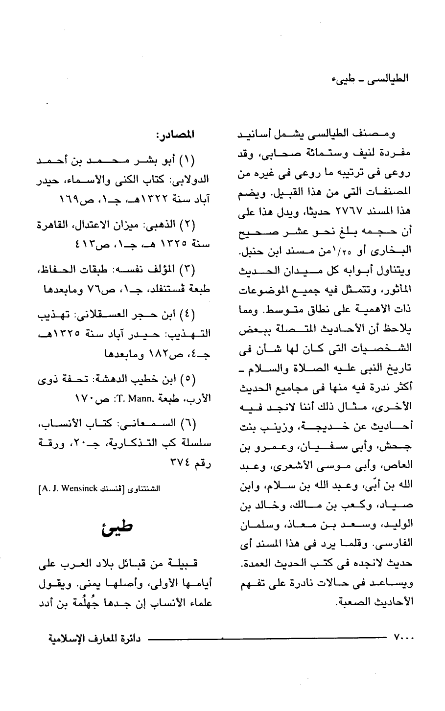 ومصنف الطيالسى يشمل أسانيد مفردة لنيف وستمائة صحابى، وقد روعى فى ترتيبه ما روعى فى غيره من المصنفات التى من هذا القبيل. ويضم هذا المسند 2767 حديثًا، ويدل هذا على أن حجمه بلغ نحو عشر صحيح البخارى أو 1/ 25 من مسند ابن حنبل. ويتناول أبوابه كل ميدان الحديث المأثور، وتتمثل فيه جميع الموضوعات ذات الأهمية على نطاق متوسط. ومما يلاحظ أن الأحاديث المتصلة ببعض الشخصيات التى كان لها شأن فى تاريخ النبى عليه الصلاة والسلام -أكثر ندرة فيه منها فى مجاميع الحديث الأخرى، مثال ذلك أننا لا نجد فيه أحاديث عن خديجة، وزينب بنت جحش، وأبى سفيان، وعمرو بن العاص، وأبى موسى الأشعرى، وعبد اللَّه بن أبىّ، وعبد اللَّه بن سلام، وابن صياد، وكعب بن مالك، وخالد بن الوليد، وسعد بن معاذ، وسلمان الفارسى. وقلما يرد فى هذا المسند أى حديث لا نجده فى كتب الحديث العمدة. ويساعد فى حالات نادرة على تفهم الأحاديث الصعبة.