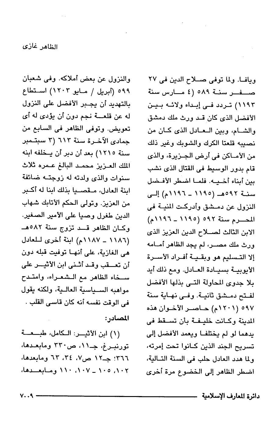 ويافا. ولما توفى صلاح الدين فى 27 صفر سنة 589 (4 مارس سنة 1193) تردد فى إبداء ولائه بين الأفضل الذى كان قد ورث ملك دمشق والشام، وبين العادل الذى كان من نصيبه قلعتا الكرك والشوبك وغير ذلك من الأماكن فى أرض الجزيرة، والذى قام بدور الوسيط فى القتال الذى نشب بين أبناء أخيه. فلما اضطر الأفضل سنة 592 هـ (1195 - 1196 م) إلى النزول عن دمشق وأدركت المنية فى المحرم سنة 592 (1195 - 1196 م) الابن الثالث لصلاح الدين العزيز الذى ورث ملك مصر، لم يجد الظاهر أمامه إلا التسليم هو وبقية أفراد الأسرة الأيوبية بسيادة العادل. ومع ذلك أيد بلا جدوى المحاولة التى بذلها الأفضل لفتح دمشق ثانية. وفى نهاية سنة 597 (1201 م) حاصر الأخوان هذه المدينة وكانت خليفة بأن تسقط فى يدهما لو لم يختلفا ويعمد الأفضل إلى تسريح الجند الذين كانوا تحت إمرته، ولما هدد العادل حلب فى السنة التالية، اضطر الظاهر إلى الخضوع مرة أخرى والنزول عن بعض أملاكه. وفى شعبان 599 (أبريل/ مايو 1203) استطاع بالتهديد أن يجبر الأفضل على النزول له عن قلعة نجم دون أن يؤدى له أى تعويض. وتوفى الظاهر فى السابع من جمادى الآخرة سنة 613 (3 سبتمبر سنة 1215) بعد أن دبر أن يخلفه ابنه الملك العزيز محمد البالغ عمره ثلاث سنوات والذى ولدته له زوجته ضائفة ابنة العادل، مقصيًا بذلك ابنا له أكبر من العزيز. وتولى الحكم الأتابك شهاب الدين طغرل وصيا على الأمير الصغير. وكان الظاهر قد تزوج سنة 582 هـ (1186 - 1187 م) ابنة أخرى للعادل هى الغازية، على أنها توفيت قبله دون أن تعقب وقد أثنى ابن الأثير على سخاء الظاهر مع الشعراء، وامتدح مواهبه السياسية العالية، ولكنه يقول فى الوقت نفسه أنه كان قاسى القلب.