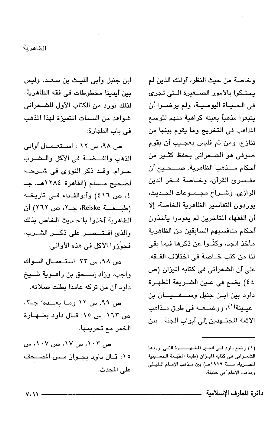 (¬1) وضع داود فى العين المطهرة التى أوردها الشعرانى فى كتابه الميزان (طبعة المطبعة الحسينية المصرية، سنة 1929 هـ) بين مذهب الإمام الليثى ومذهب الإمام أبى حنيفة.