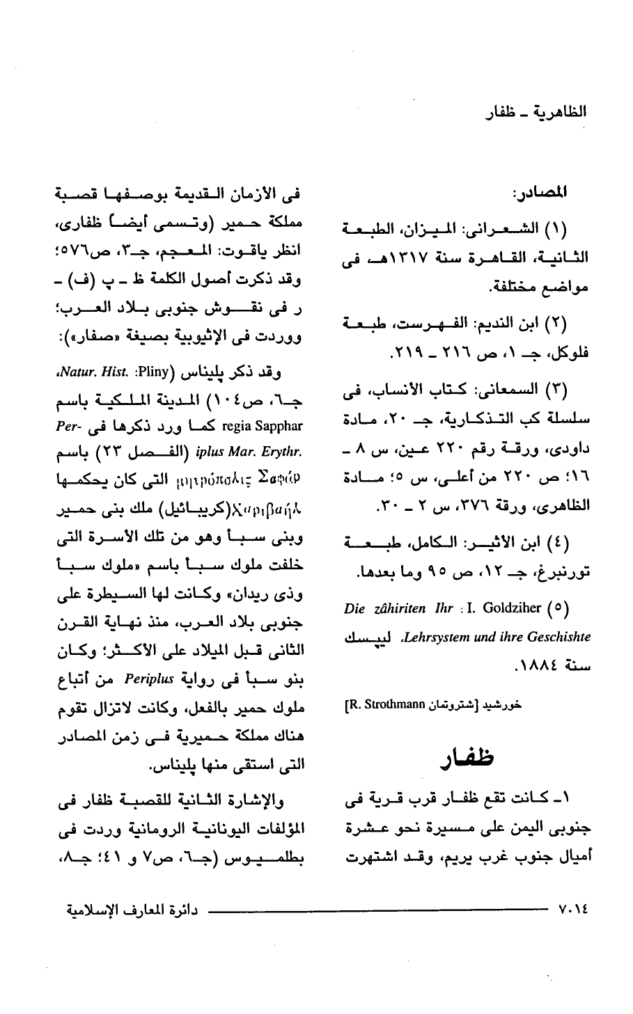 1 - كانت تقع ظفار قرب قرية فى جنوبى اليمن على مسيرة نحو عشرة أميال جنوب غرب يريم، وقد اشتهرت فى الأزمان القديمة بوصفها قصبة مملكة حمير (وتسمى أيضًا ظفارى، انظر ياقوت: المعجم، جـ 3، ص 706؛ وقد ذكرت أصول الكلمة ظ - ب (ف) - ر فى نقوش جنوبى بلاد العرب؛ ووردت فى الإثيوبية بصيغة "صفار"):
