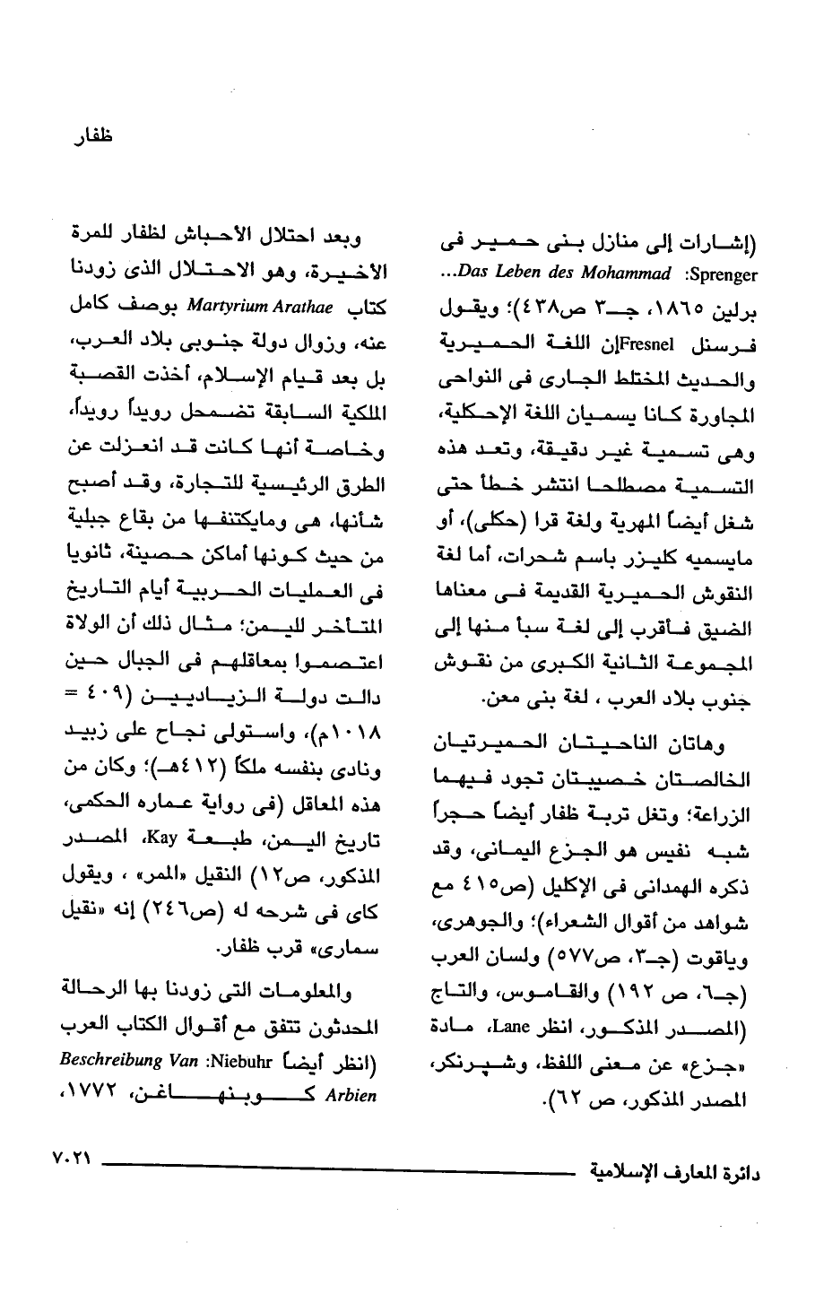 وبعد احتلال الأحباش لظفار للمرة الأخيرة، وهو الاحتلال الذى زودنا كتاب Martyrium Arathae؛ بوصف كامل عنه، وزوال دولة جنوبى بلاد العرب، بل بعد قيام الإسلام، أخذت القصبة الملكية السابقة تضمحل رويدًا رويدًا، وخاصة أنها كانت قد انعزلت عن الطرق الرئيسية للتجارة، وقد أصبح شأنها، هى وما يكتنفها من بقاع جبلية من حيث كونها أماكن حصينة، ثانويًا فى العمليات الحربية أيام التاريخ المتأخر لليمن؛ مثال ذلك أن الولاة اعتصموا بمعاقلهم فى الجبال حين دالت دولة الزياديين (409 = 1018 م)، واستولى نجاح على زبيد ونادى بنفسه ملكًا (412 هـ)؛ وكان من هذه المعاقل (فى رواية عماره الحكمى، تاريخ اليمن، طبعة Key، المصدر المذكور، ص 12) النقيل "المر"، ويقول كاى فى شرحه له (ص 246) أنه "نقيل سمارى" قرب ظفار.