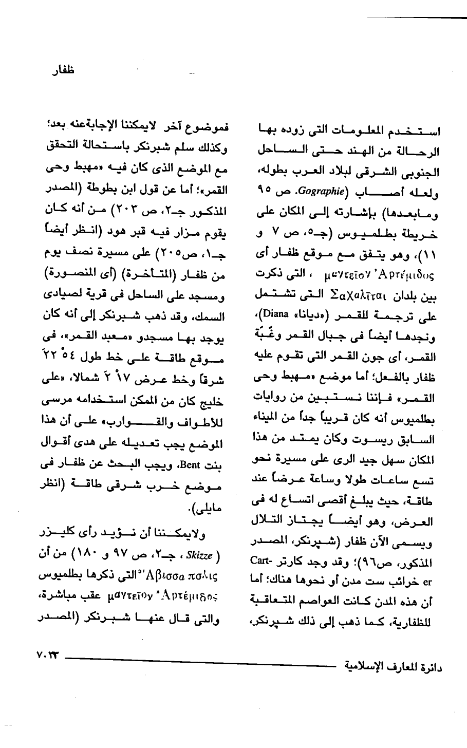 استخدم المعلومات التى زوده بها الرحالة من الهند حتى الساحل الجنوبى الشرقى لبلاد العرب بطوله، ولعله أصاب (Gographie، ص 95 وما بعدها) بإشارته إلى المكان على خريطة بطلميوس (جـ 5، ص 7 و 11)، وهو يتفق مع موقع ظفار أى التى ذكرت بين بلدان التى تشتمل على ترجمة للقمر ("ديانا" Diana)، ونجدها أيضًا فى جبال القمر وغبة القمر، أى جون القمر التى تقوم عليه ظفار بالفعل؛ أما موضع "مهبط وحى القمر" فإننا نستبين من روايات بطلميوس أنه كان قريبًا جدًا من الميناء السابق ريسوت وكان يمتد من هذا المكان سهل جيد الرى على مسيرة نحو تسع ساعات طولًا وساعة عرضا عند طاقة، حيث يبلغ أقصى اتساع له فى العرض، وهو أيضًا يجتاز التلال ويسمى الآن ظفار (شيرنكر، المصدر المذكور، ص 96)؛ وقد وجد كارتر Carter خرائب ست مدن أو نحوها هناك؛ أما أن هذه المدن كانت العواصم المتعاقبة للظفارية، كما ذهب إلى ذلك شيرنكر، فموضوع آخر لا يمكننا الإجابة عنه بعد؛ وكذلك سلم شبرنكر باستحالة التحقق مع الموضع الذى كان فيه "مهبط وحى القمر"؛ أما عن قول ابن بطوطة (المصدر المذكور جـ 2، ص 203) من أنه كان يقوم مزار فيه قبر هود (انظر أيضًا جـ 1، ص 203) على مسيرة نصف يوم من ظفار (المتأخرة) (أى المنصورة) ومسجد على الساحل فى قرية لصيادى السمك، وقد ذهب شبرنكر إلى أنه كان يوجد بها مسجدو "معبد القمر"، فى موقع طاقة على خط طول 54 ْ 22 َ شرقًا وخط عرض 17 ْ 2 َ شمالًا، "على خليج كان من الممكن استخدامه مرسى للأطواف والقوارب" على أن هذا الموضع يجب تعديله على هدى أقوال بنت Bent، ويجب البحث عن ظفار فى موضع خرب شرقى طاقة (انظر ما يلى).