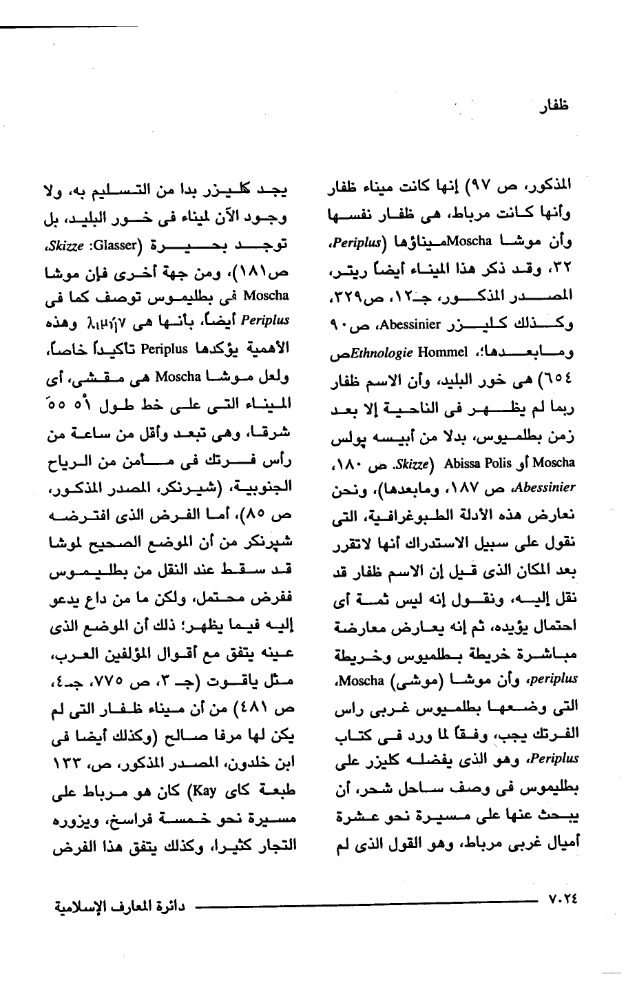 المذكور، ص 97) إنها كانت ميناء ظفار وأنها كانت مرباط، هى ظفار نفسها وإن موشا Moscha ميناؤها (Periplus، 32، وقد ذكر هذا الميناء أيضًا ريتر، المصدر المذكور، جـ 12، ص 329، وكذلك كليزر Abessinier، ص 90 وما بعدها؛ Ethnologie Hommel, ص 654) هى خور البليد، وإن الاسم ظفار ربما لم يظهر فى الناحية إلا بعد زمن بطلميوس، بدلا من أبيسه يولس Mosche أو Skizze) Abissa Polis، ص 180، Abessinier، ص 187 وما بعدها)، ونحن نعارض هذه الأدلة الطبوغرافية، التى نقول على سبيل الاستدراك أنها لا تقرر بعد المكان الذى قيل إن الاسم ظفار قد نقل إليه، ونقول إنه ليس ثمة أى احتمال يؤيده، ثم أنه يعارض معارضة مباشرة خريطة بطلميوس وخريطة Periplus، وأن موشا (موشى) Moscha، التى وضعها بطلميوس غربى رأس الفرتك يجب، وفقًا لما ورد فى كتاب Periplus، وهو الذى يفضله كليزر على بطليموس فى وصف ساحل شحر، أن يبحث عنها على مسيرة نحو عشرة أميال غربى مرباط، وهو القول الذى لم يجد كليزر بدا من التسليم به، ولا وجود الآن لميناء فى خور البليد، جل توجد بحيرة (Skizze: Glasser، ص 181)، ومن جهة أخرى فإن موشا Moscha فى بطليموس توصف كما فى Periplus أيضًا، بأنها هى وهذه الأهمية يؤكدها Periplus تأكيدًا خاصًا، ولعل موشا Moscha هى مقشى، أى الميناء التى على خط طول 51 ْ 55 َ شرقًا، وهى تبعد وأقل من ساعة من رأس فردن فى مأمن من الرياح الجنوبية، (شيرنكر، المصدر المذكور، ص 85)، أما الفرض الذى افترضه شبرنكر من أن الموضع الصحيح لموشا قد سقط عند النقل من بطليموس ففرض محتمل، ولكن ما من داع يدعو إليه فيما يظهر؛ ذلك أن الموضع الذى عينه يتفق مع أقوال المؤلفين العرب، مثل ياقوت (جـ 3، ص 775، جـ 4، ص 481) من أن ميناء ظفار التى لم يكن لها مرفأ صالح (وكذلك أيضًا فى ابن خلدون، المصدر المذكور، ص 133 طبعة كاى Kay) كان هو مرباط على مسيرة نحو خمسة فراسخ، ويزوره التجار كثيرًا، وكذلك يتفق هذا الفرض