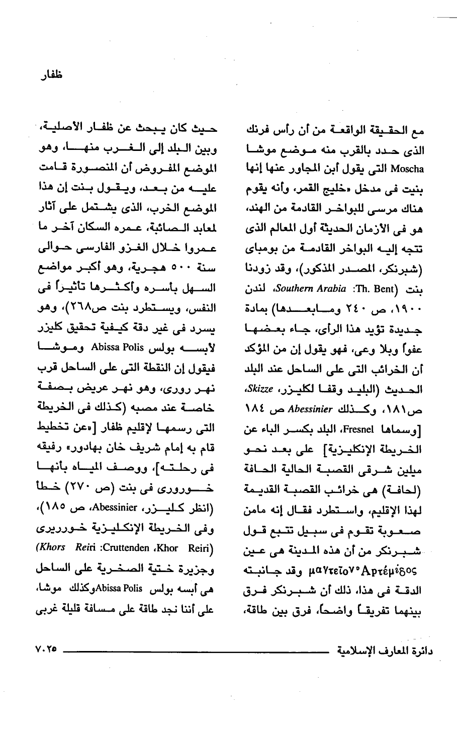 مع الحقيقة الواقعة من أن رأس فرنك الذى حدد بالقرب منه موضع موشا Moscha التى يقول ابن المجاور عنها إنها بنيت فى مدخل "خليج القمر، وأنه يقوم هناك مرسى للبواخر القادمة من الهند، هو فى الأزمان الحديثة أول المعالم الذى تتجه إليه البواخر القادمة من بومباى (شبرنكر، المصدر المذكور)، وقد زودنا بنت (Southern Arabia: Th. Bent, لندن 1900، ص 240 وما بعدها) بمادة جديدة تؤيد هذا الرأى، جاء بعضها عفوًا وبلا وعى، فهو يقول إن من المؤكد أن الخرائب التى على الساحل عند البلد الحديث (البليد وقفًا لكليزر، Skizze، ص 181، وكذلك Abessinier ص 184 [وسماها Fresnel، البلد بكسر الباء عن الخريطة الإنكليزية] على بعد نحو ميلين شرقى القصبة الحالية الحافة (لحافة) هى خرائب القصبة القديمة لهذا الإقليم، واستطرد فقال إنه ما من صعوبة تقوم فى سبيل تتبع قول شبرنكر من أى هذه المدينة هى عين وقد جانبته الدقة فى هذا، ذلك أن شبرنكر فرق بينهما تفريقًا واضحًا، فرق بين طاقة، حيث كان يبحث عن ظفار الأصلية، وبين البلد إلى الغرب منها، وهو الموضع المفروض أن المنصورة قامت عليه من بعد، ويقول بنت إن هذا الموضع الخرب، الذى يشتمل على آثار لمعابد الصائبة، عمره السكان آخر ما عمروا خلال الغزو الفارسى حوالى سنة 500 هجرية، وهو أكبر مواضع السهل بأسره وأكثرها تأثيرًا فى النفس، ويستطرد بنت ص 268)، وهو يسرد فى غير دقة كيفية تحقيق كليزر لأبسه بولس Abissa Polis وموشا فيقول إن النقطة التى على الساحل قرب نهر رورى، وهو نهر عريض بصفة خاصة عند مصبه (كذلك فى الخريطة التى رسمها لإقليم ظفار ["عن تخطيط قام به إمام شريف خان بهادور" رفيقه فى رحلته]، ووصف المياه بأنها خورورى فى بنت (ص 270) خطأ (انظر كليزر, Abessinier، ص 185) وفى الخريطة الإنكليزية خورريرى (Khors Reiri: Cruttenden .Khor Reiri) وجزيرة ختية الصحرية على الساحل هى أبسه بولس Abissa Polis وكذلك موشا، على أننا نجد طاقة على مسافة قليلة غربى