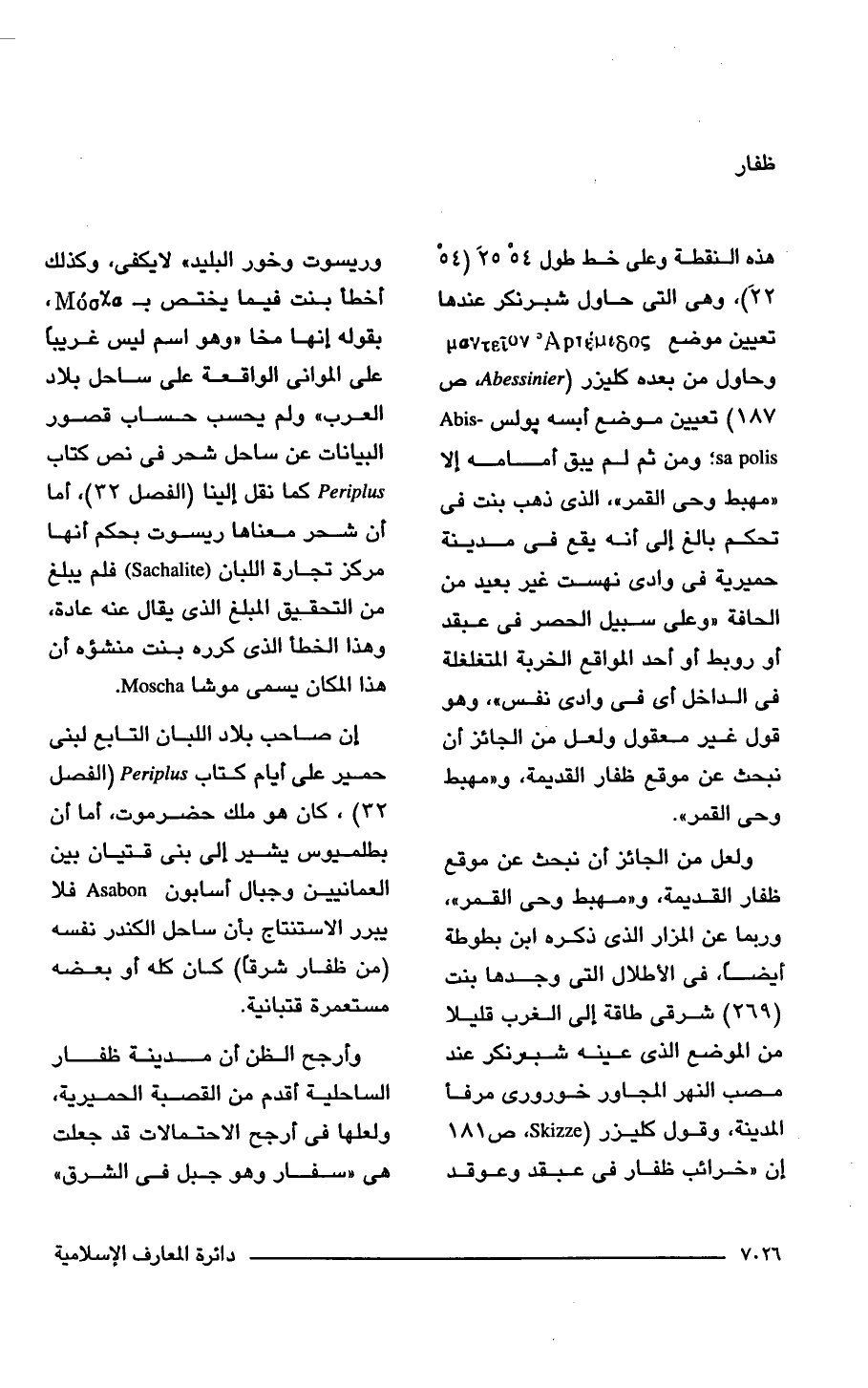 ولعل من الجائز أن نبحث عن موقع ظفار القديمة، و"مهبط وحى القمر"، وربما عن المزار الذى ذكره ابن بطوطة أيضًا، فى الأطلال التى وجدها بنت (269) شرقى طاقة إلى الغرب قليلًا من الموضع الذى عينه شبرنكر عند مصب النهر المجاور خوروى مرفأ المدينة، وقول كليزر (Skizze، ص 181 إن "خرائب ظفار فى عبقد وعوقد وريسوت وخور البليد" لا يكفى، وكذلك اخطأ بنت فيما يختص ب بقوله إنها مخا "وهو اسم ليس غريبًا على الموانى الواقعة على ساحل بلاد العرب" ولم يحسب حساب قصور البيانات عن ساحل شحر فى نص كتاب Periplus كما نقل إلينا (الفصل 32)، أما أن شحر معناها ريسوت بحكم أنها مركز تجارة اللبان (Sachalite) فلم يبلغ من التحقيق المبلغ الذى يقال عنه عادة، وهذا الخطأ الذى كرره بنت منشؤه أن هذا المكان يسمى موشا Moscha.