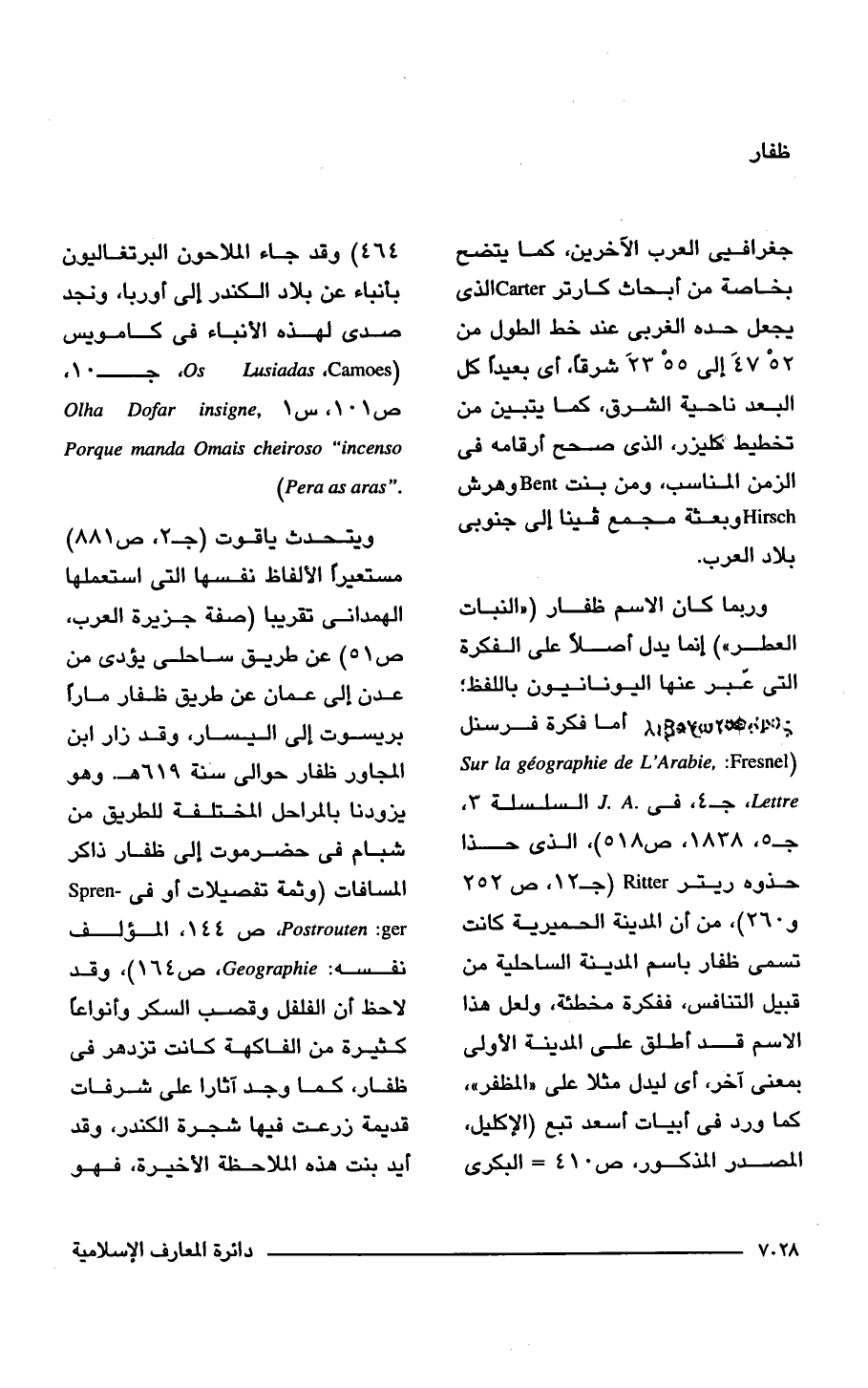 جغرافيى العرب الآخرين، كما يتضح بخاصة من أبحاث كارتر Carter الذى يجعل حده الغربى عند خط الطول من 52 ْ 47 َ إلى 55 ْ 23 َ شرقًا، أى بعيدًا كل البعد ناحية الشرق، كما يتبين من تخطيط كليزر، الذى صحح أرقامه فى الزمن المناسب، ومن بنت Bent وهرش Hirsch وبعثة مجمع فينا إلى جنوبى بلاد العرب.