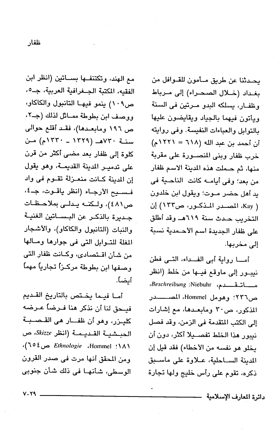 أما رواية أبى الفداء، التى فطن نيبور إلى ما وقع فيها من خلط (انظر ما تقدم، Beschreibung Niebuhr ص 236؛ وهومل Hommel, المصدر المذكور، ص 30 وما بعدها، مع إشارات إلى الكتب المتقدمة فى الزمن، وقد فصل نيبور هذا الخلط تفصيلًا أكثر، دون أن يخلو هو نفسه من الأخطاء) فقد قيل إن المدينة الساحلية، علاوة على ما سبق ذكره، تقوم على رأس خليج ولها تجارة مع الهند، وتكتنفها بساتين (انظر ابن الفقيه، المكتبة الجغرافية العربية، جـ 5، ص 109) ينمو فيها التانبول والكاكاو، ووصف ابن بطوطة مماثل لذلك (جـ 2، (ص 196 وما بعدها)، فقد أقلع حوالى سنة 730 هـ (1329 - 1330 م) من كلوة إلى ظفار بعد مضى أكثر من قرن على تدمير المدينة القديمة، وهو يقول إن المدينة كانت منعزلة تقوم فى واد فسيح الأرجاء (انظر ياقوت، جـ 4، ص 481)، ولكنه يدلى بملاحظات جديرة بالذكر عن البساتين الغنية والنبات (التانبول والكاكاو)، والأشجار المغلة للتوابل التى فى جوارها ومالها من شأن اقتصادى، وكانت ظفار التى وصفها ابن بطوطة مركز، تجاريًا مهمًا أيضًا.