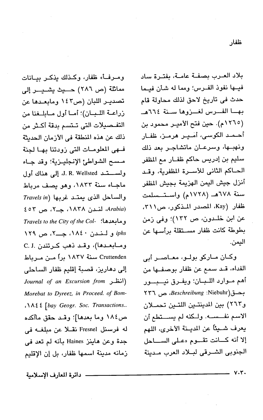 وكان ماركو بولو، معاصر أبى الفداء، قد سمع عن ظفار بوصفها من أهم موارد اللبان؛ ويفرق نيبور بحق (Beschreibung: Niebuhr، ص 226 و 263) بين المدينتين اللتين تحملان الاسم نفسه. ولكنه لم يستطع أن يعرف شيئًا عن المدينة الأخرى، اللهم إلا أنه كانت تقوم "على الساحل الجنوبى الشرقى لبلاد العرب مدينة ومرفأ" ظفار، وكذلك يذكر بيانات مماثلة (ص 286) حيث يشير إلى تصدير اللبان (ص 143 وما بعدها عن زراعة اللبان)؛ أما أول ما بلغنا من التفصيلات التى تتسم بدقة أكثر من ذلك عن هذه المنطقة فى الأزمان الحديثة فهى المعلومات التى زودتنا بها لجنة مسح الشواطى الإنجليزية؛ وقد جاء ولستد J. R. Wellsted إلى هناك أول ما جاء سنة 1833، وهو يصف مرباط والساحل الذى يمتد غربها (Travels in Arabia)، لندن جـ 2، ص 453 وما بعدها؛ Travels to the City of the Coliphs؛ ولندن 1840، جـ 2، ص 129 وما بعدها)، وقد ذهب كرتندن C.J.Cruttenden سنة 1837 برًا من مرباط إلى دهاريز، قصبة إقليم ظفار الساحلى (انظر Journal of an Excursion from Morebat to Dyreez, in Proceed. of Bombay Geogr. Soc. Transactions , . . [1844، ص 184 وما بعدها] وقد حقق ما أكده له فرسنل Fresnel نقلا عن مبلغه فى جدة وعن هاينز Haines بأنه لم تعد فى زمانه مدينة اسمها ظفار، بل إن الإقليم