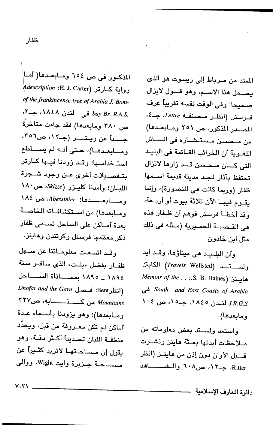 الممتد من مرباط إلى ريسوت هو الذى يحمل هذا الاسم، وهو قول لا يزال صحيحًا؛ وفى الوقت نفسه تقريبًا عرف فرسنل (انظر مصنفه Lettro، جـ 4، المصدر المذكور، ص 251 وما بعدها) من محسن مستشاره فى المسائل اللغوية أن الخرائب القائمة فى البليد التى كان محسن قد زارها لا تزال تحتفظ بآثار لمجد مدينة قديمة اسمها ظفار (وربما كانت هى المنصورة)، وإنما يقوم فيها الآن ثلاثة بيوت أو أربعة، وقد أخطأ فرسنل فوهم أن ظفار هذه هى القصبة الحميرية (مثله فى ذلك مثل ابن خلدون وأن البليد هى ميناؤها، وقد ايد ولستد (Travels: Wellsted) الكابتن هاينز (Memoir of the . .South and East Coasts of Arabia: S. B. Haines فى J.R.G.S لندن 1845، جـ 15، ص 104 وما بعدها).