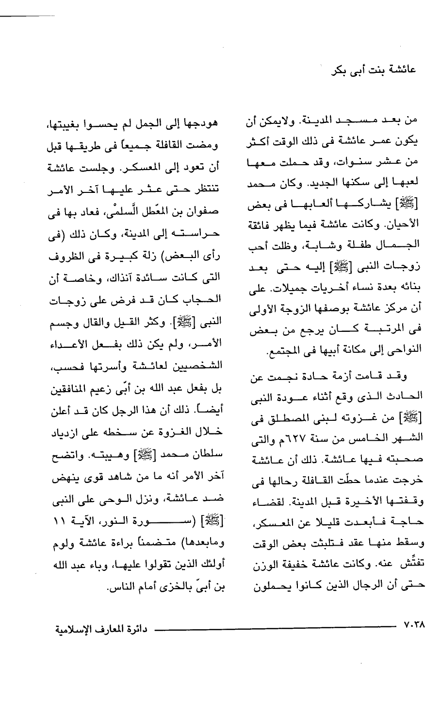 وقد قامت أزمة حادة نجمت عن الحادث الذى وقع أثناء عودة النبى [-صلى اللَّه عليه وسلم-] من غزوته لبنى المصطلق فى الشهر الخامس من سنة 627 م والتى صحبته فيها عائشة. ذلك أن عائشة خرجت عندما حطّت القافلة رحالها فى وقفتها الأخيرة قبل المدينة. لقضاء حاجة فأبعدت قليلا عن المعسكر، وسقط منها عقد فتلبثت بعض الوقت تفتِّش عنه. وكانت عائشة خفيفة الوزن حتى أن الرجال الذين كانوا يحملون هودجها إلى الجمل لم يحسوا بغيبتها، ومضت القافلة جميعًا فى طريقها قبل أن تعود إلى المعسكر. وجلست عائشة تنتظر حتى عثر عليها آخر الأمر صفوان بن المعطل السلمى، فعاد بها فى حراسته إلى المدينة، وكان ذلك (فى رأى البعض) زلة كبيرة فى الظروف التى كانت سائدة آنذاك، وخاصة أن الحجاب كان قد فرض على زوجات النبى [-صلى اللَّه عليه وسلم-]. وكثر القيل والقال وجسم الأمر، ولم يكن ذلك بفعل الأعداء الشخصيين لعائشة وأسرتها فحسب، بل بفعل عبد اللَّه بن أبىّ زعيم المنافقين أيضًا. ذلك أن هذا الرجل كان قد أعلن خلال الغزوة عن سخطه على ازدياد سلطان محمد [-صلى اللَّه عليه وسلم-] وهيبته. واتضح آخر الأمر أنه ما من شاهد قوى ينهض ضد عائشة، ونزل الوحى على النبى [-صلى اللَّه عليه وسلم-] (سورة النور، الآية 11 وما بعدها) متضمنًا براءة عائشة ولوم أولئك الذين تقولوا عليها، وباء عبد اللَّه بن أبىّ بالخزى أمام الناس.