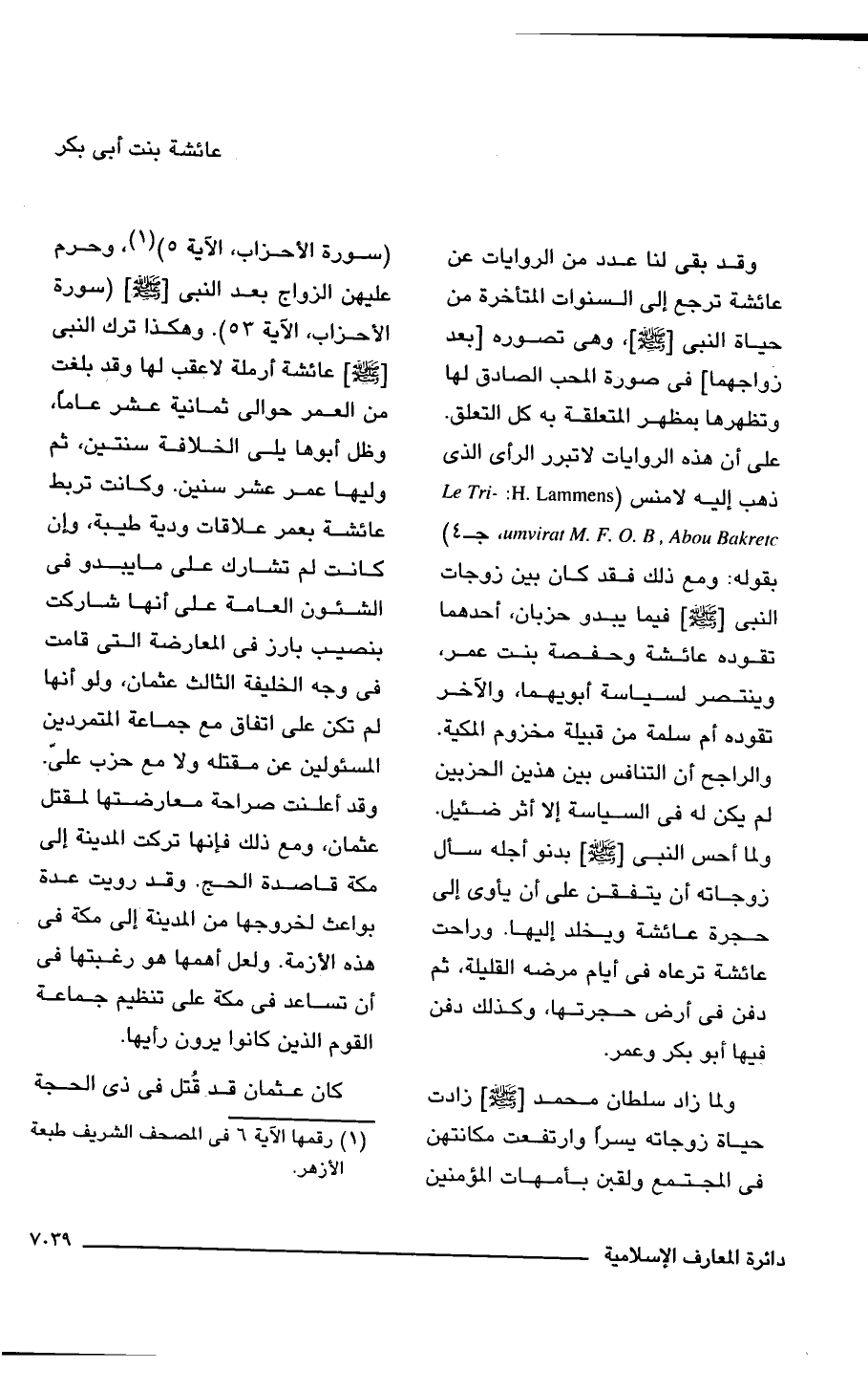 ولما زاد سلطان محمد [-صلى اللَّه عليه وسلم-] زادت حياة زوجاته يسرًا وارتفعت مكانتهن فى المجتمع ولقبن بأمهات المؤمنين (سورة الأحزاب، الآية 5) (¬1)، وحرم عليهن الزواج بعد النبى [-صلى اللَّه عليه وسلم-] (سورة الأحزاب، الآية 53). وهكذا ترك النبى [-صلى اللَّه عليه وسلم-] عائشة أرملة لا عقب لها وقد بلغت من العمر حوالى ثمانية عشر عامًا، وظل أبوها يلى الخلافة سنتين، ثم وليها عمر عشر سنين. وكانت تربط عائشة بعمر علاقات ودية طيبة، وإن كانت لم تشارك على ما يبدو فى الشئون العامة على أنها شاركت بنصيب بارز فى المعارضة التى قامت فى وجه الخليفة الثالث عثمان، ولو أنها لم تكن على اتفاق مع جماعة المتمردين المسئولين عن مقتله ولا مع حزب علىّ. وقد أعلنت صراحة معارضتها لمقتل عثمان، ومع ذلك فإنها تركت المدينة إلى مكة قاصدة الحج. وقد رويت عدة بواعث لخروجها من الدينة إلى مكة فى هذه الأزمة. ولعل أهمها هو رغبتها فى أن تساعد فى مكة على تنظيم جماعة القوم الذين كانوا يرون رأيها.
