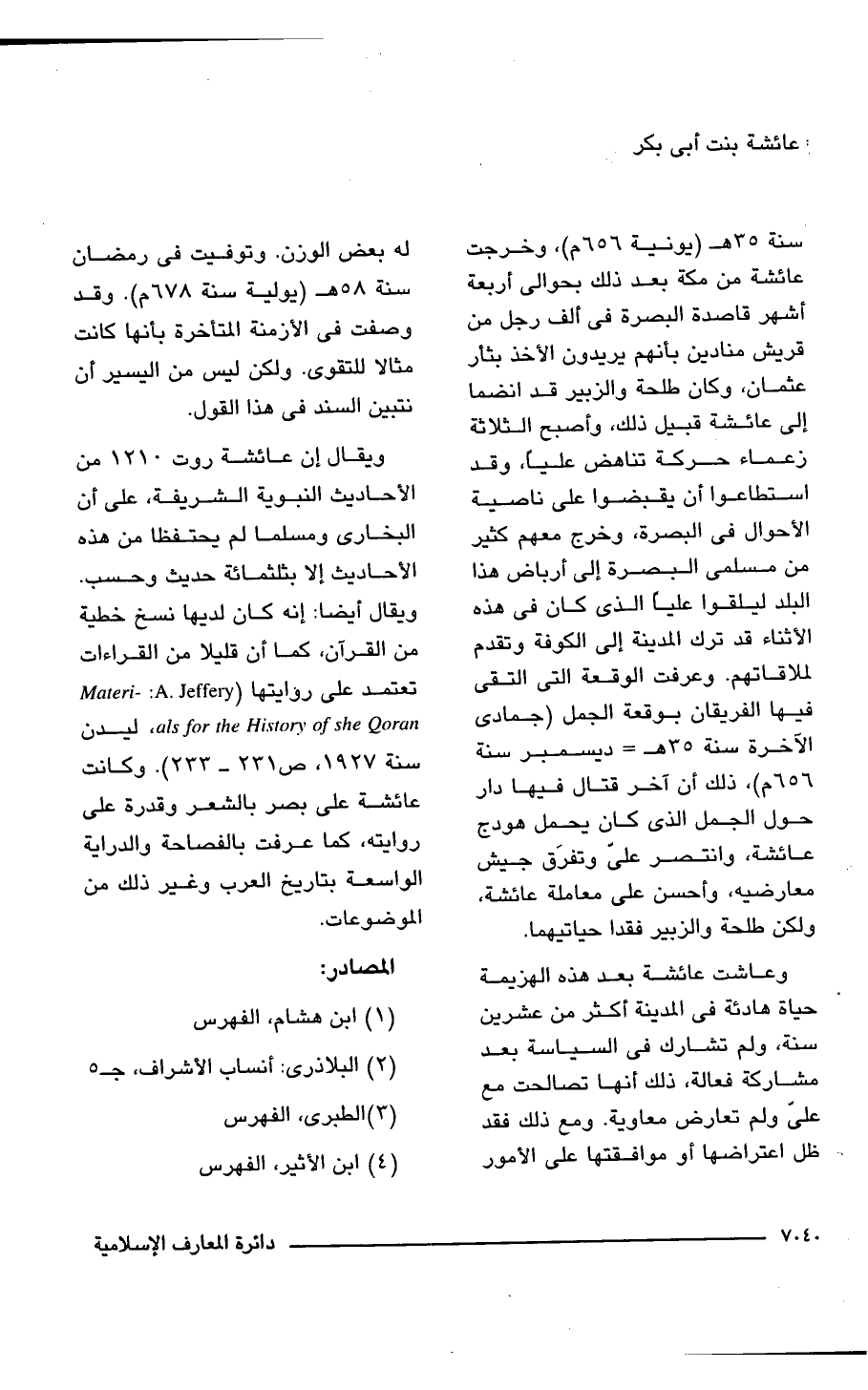 سنة 35 هـ (يونية 656 م)، وخرجت عائشة من مكة بعد ذلك بحوالى أربعة أشهر قاصدة البصرة فى ألف رجل من قريش منادين بأنهم يريدون الأخذ بثأر عثمان، وكان طلحة والزبير قد انضما إلى عائشة قبيل ذلك، وأصبح الثلاثة زعماء حركة تناهض عليًا، وقد استطاعوا أن يقبضوا على ناصية الأحوال فى البصرة، وخرج معهم كثير من مسلمى البصرة إلى أرباض هذا البلد ليلقوا عليًا الذى كان فى هذه الأثناء قد ترك المدينة إلى الكوفة وتقدم لملاقاتهم. وعرفت الوقعة التى التقى فيها الفريقان بوقعة الجمل (جمادى الآخرة سنة 35 هـ = ديسمبر سنة 656 م)، ذلك أن آخر قتال فيها دار حول الجمل الذى كان يحمل هودج عائشة، وانتصر علىّ وتفرَق جيش معارضيه، وأحسن على معاملة عائشة، ولكن طلحة والزبير فقدا حياتيهما.