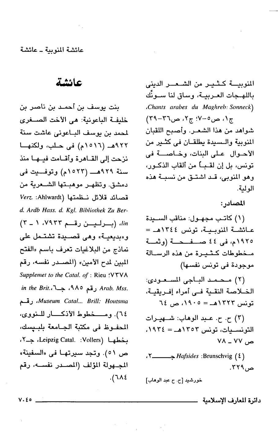 (1) كاتب مجهول: مناقب السيدة عائشة المنوبية، تونس 1344 هـ = 1925 م، فى 44 صفحة (وثمة مخطوطات كثيرة من هذه الرسالة موجودة فى تونس نفسها)
