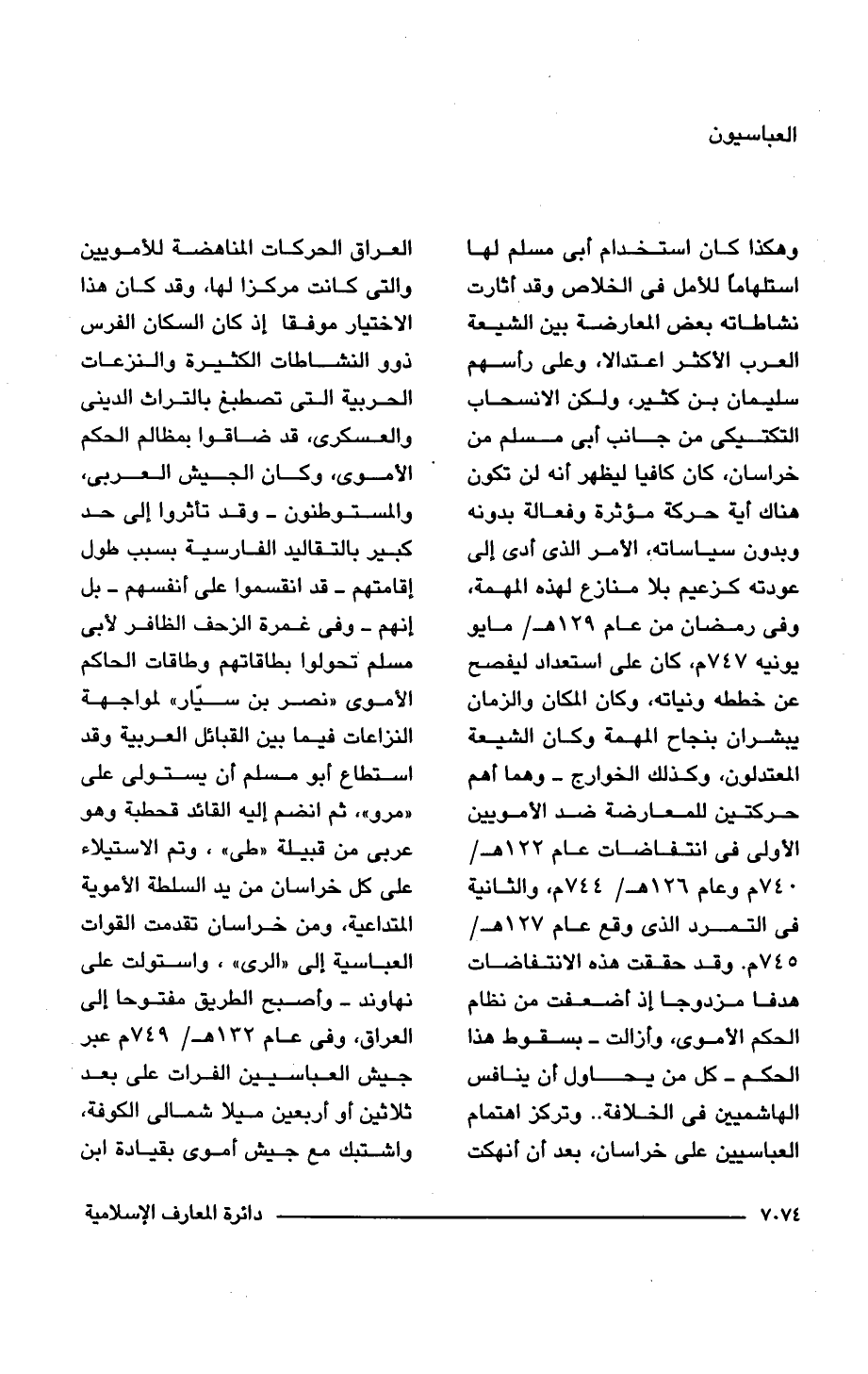 وهكذا كان استخدام أبى مسلم لها استلهامًا للأمل فى الخلاص وقد أثارت نشاطاته بعض المعارضة بين الشيعة العرب الأكثر اعتدالا، وعلى رأسهم سليمان بن كثير، ولكن الانسحاب التكتيكى من جانب أبى مسلم من خراسان، كان كافيا ليظهر أنه لن تكون هناك أية حركة مؤثرة وفعالة بدونه وبدون سياساته، الأمر الذى أدى إلى عودته كزعيم بلا منازع لهذه المهمة، وفى رمضان من عام 129 هـ/ مايو يونيه 747 م، كان على استعداد ليفصح عن خططه ونياته، وكان المكان والزمان يبشران بنجاح المهمة وكان الشيعة المعتدلون، وكذلك الخوارج -وهما أهم حركتين للمعارضة ضد الأمويين الأولى فى انتفاضات عام 122 هـ/ 740 م وعام 126 هـ/ 744 م، والثانية فى التمرد الذى وقع عام 127 هـ/ 745 م. وقد حققت هذه الانتفاضات هدفا مزدوجا إذ أضعفت من نظام الحكم الأموى، وأزالت -بسقوط هذا الحكم- كل من يحاول أن ينافس الهاشميين فى الخلافة. . وتركز اهتمام العباسيين على خراسان، بعد أن أنهكت العراق الحركات المناهضة للأمويين والتى كانت مركزا لها، وقد كان هذا الاختيار موفقا إذ كان السكان الفرس ذوو النشاطات الكثيرة والنزعات الحربية التى تصطبغ بالتراث الدينى والعسكرى، قد ضاقوا بمظالم الحكم الأموى، وكان الجيش العربى، والمستوطنون -وقد تأثروا إلى حد كبير بالتقاليد الفارسية بسبب طول إقامتهم- قد انقسموا على أنفسهم -بل إنهم- وفى غمرة الزحف الظافر لأبى مسلم. تحولوا بطاقاتهم وطاقات الحاكم الأموى "نصر بن سيّار" لمواجهة النزاعات فيما بين القبائل العربية وقد استطاع أبو مسلم أن يستولى على "مرو"، ثم انضم إليه القائد قحطبة وهو عربى من قبيلة "طى"، وتم الاستيلاء على كل خراسان من يد السلطة الأموية المتداعية، ومن خراسان تقدمت القوات العباسية إلى "الرى"، واستولت على نهاوند -وأصبح الطريق مفتوحا إلى العراق، وفى عام 132 هـ/ 749 م عبر جيش العباسيين الفرات على بعد ثلاثين أو أربعين ميلا شمالى الكوفة، واشتبك مع جيش أموى بقيادة ابن