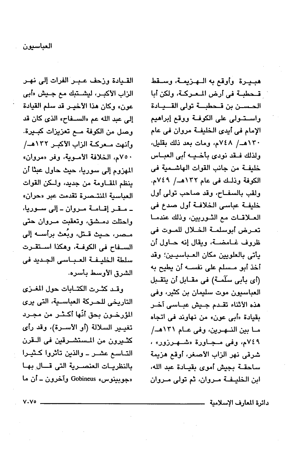 هبيرة وأوقع به الهزيمة، وسقط قحطبة فى أرض المعركة، ولكن أبا الحسن بن قحطبة تولى القيادة واستولى على الكوفة ووقع إبراهيم الإمام فى أيدى الخليفة مروان فى عام 130 هـ/ 748 م، ومات بعد ذلك بقليل، ولذلك فقد نودى بأخيه أبى العباس خليفة من جانب القوات الهاشمية فى الكوفة وذلك فى عام 132 هـ/ 749 م. ولقب بالسفاح، وقد صاحب تولى أول خليفة عباسى الخلافة أول صدع فى العلاقات مع الثوريين، وذلك عندما تعرض أبو سلمة الخلال للموت فى ظروف غامضة، ويقال إنه حاول أن يأتى بالعلويين مكان العباسيين؛ وقد أخذ أبو مسلم على نفسه أن يطيح به (أى بأبى سَلَمة) فى مقابل أن يتقبل العباسيون موت سليمان بن كثير، وفى هذه الأثناء تقدم جيش عباسى آخر بقيادة "أبى عون" من نهاوند فى اتجاه ما بين النهرين، وفى عام 131 هـ/ 749 م، وفى مجاورة "شهرزور"، شرقى نهر الزاب الأصغر، أوقع هزيمة ساحقة بجيش أموى بقيادة عبد اللَّه، ابن الخليفة مروان، ثم تولى مروان القيادة وزحف عبر الفرات إلى نهر الزاب الأكبر، ليشتبك مع جيش "أبى عون" وكان هذا الأخير قد سلم القيادة إلى عبد اللَّه عم "السفاح" الذى كان قد وصل من الكوفة مع تعزيزات كبيرة. وأنهت معركة الزاب الأكبر 132 هـ/ 750 م، الخلافة الأموية، وفرن "مروان" المهزوم إلى سوريا، حيث حاول عبثا أن ينظم المقاومة من جديد، ولكن القوات العباسية المنتصرة تقدمت عبر "حران" -مقر إقامة مروان- إلى سوريا، واحتلت دمشق، وتعقبت مروان حتى مصر، حيث قتل، وبُعث برأسه إلى السفاح فى الكوفة، وهكذا استقرت سلطة الخليفة العباسى الجديد فى الشرق الأوسط بأسره.