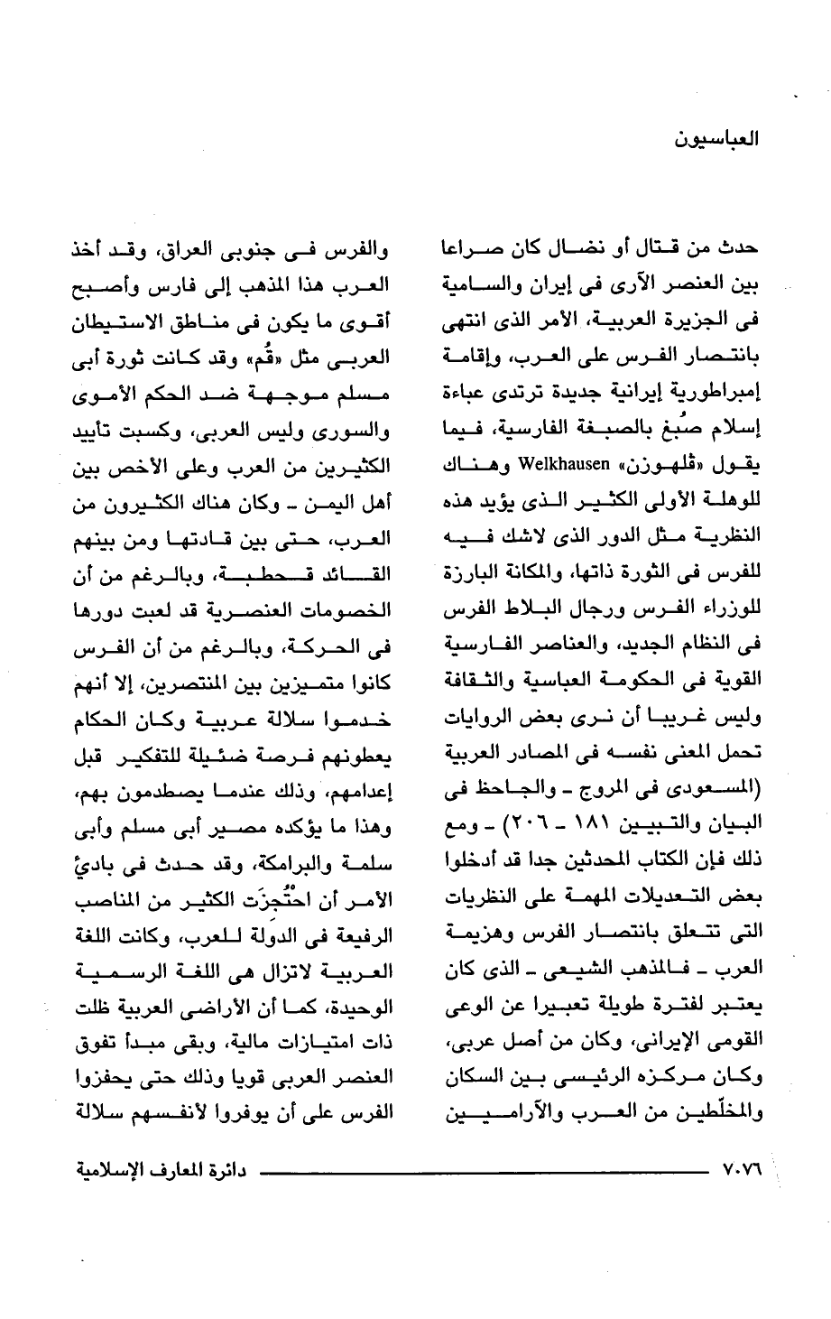 حدث من قتال أو نضال كان صراعا بين العنصر الآرى فى إيران والسامية فى الجزيرة العربية، الأمر الذى انتهى بانتصار الفرس على العرب، وإقامة إمبراطورية إيرانية جديدة ترتدى عباءة إسلام صُبغ بالصبغة الفارسية، فيما يقول "فلهوزن" Welkhausen وهناك للوهلة الأولى الكثير الذى يؤيد هذه النظرية مثل الدور الذى لاشك فيه للفرس فى الثورة ذاتها، والمكانة البارزة للوزراء الفرس ورجال البلاط الفرس فى النظام الجديد، والعناصر الفارسية القوية فى الحكومة العباسية والثقافة وليس غريبا أن نرى بعض الروايات تحمل المعنى نفسه فى المصادر العربية (المسعودى فى المروج -والجاحظ فى البيان والتبيين 181 - 206) - ومع ذلك فإن الكتاب المحدثين جدا قد أدخلوا بعض التعديلات المهمة على النظريات التى تتعلق بانتصار الفرس وهزيمة العرب -فالمذهب الشيعى- الذى كان يعتبر لفترة طويلة تعبيرا عن الوعى القومى الإيرانى، وكان من أصل عربى، وكان مركزه الرئيسى بين السكان والمخلّطين من العرب والآراميين والفرس فى جنوبى العراق، وقد أخذ العرب هذا المذهب إلى فارس وأصبح أقوى ما يكون فى مناطق الاستيطان العربى مثل "قُم" وقد كانت ثورة أبى مسلم موجهة ضد الحكم الأموى والسورى وليس العربى، وكسبت تأييد الكثيرين من العرب وعلى الأخص بين أهل اليمن -وكان هناك الكثيرون من العرب، حتى بين قادتها ومن بينهم القائد قحطبة، وبالرغم من أن الخصومات العنصرية قد لعبت دورها فى الحركة، وبالرغم من أن الفرس كانوا متميزين بين المنتصرين، إلا أنهم خدموا سلالة عربية وكان الحكام يعطونهم فرصة ضئيلة للتفكير قبل إعدامهم، وذلك عندما يصطدمون بهم، وهذا ما يؤكده مصير أبى مسلم وأبى سلمة والبرامكة، وقد حدث فى بادئ الأمر أن احْتُجِزَت الكثير من المناصب الرفيعة فى الدولة للعرب، وكانت اللغة العربية لا تزال هى اللغة الرسمية الوحيدة، كما أن الأراضى العربية ظلت ذات امتيازات مالية، وبقى مبدأ تفوق العنصر العربى قويا وذلك حتى يحفزوا الفرس على أن يوفروا لأنفسهم سلالة