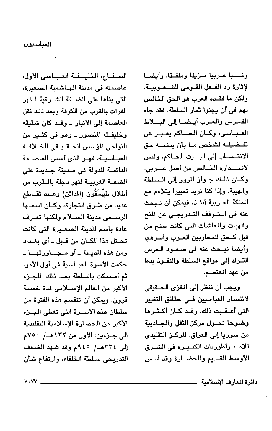 ويجب أن ننظر إلى المغزى الحقيقى لانتصار العباسيين فى حقائق التغيير التى أعقبت ذلك، وقد كان أكثرها وضوحا تحول مركز الثقل والجاذبية من سوريا إلى العراق، المركز التقليدى للامبراطوريات الكبيرة فى الشرق الأوسط القديم وللحضارة وقد أسس السفاح، الخليفة العباسى الأول، عاصمته فى مدينة الهاشمية الصغيرة، التى بناها على الضفة الشرقية لنهر الفرات بالقرب من الكوفة وبعد ذلك نقل العاصمة إلى الأنبار -وقد كان شقيقه وخليفته المنصور- وهو فى كثير من النواحى المؤسس الحقيقى للخلافة العباسية، فهو الذى أسس العاصمة الدائمة للدولة فى مدينة جديدة على الضفة الغربية لنهر دجلة بالقرب من أطلال طيْسَفُون (المدائن) وعند تقاطع عديد من طرق التجارة، وكان اسمها الرسمى مدينة السلام ولكنها تعرف عادة باسم المدينة الصغيرة التى كانت تحتل هذا المكان من قبل -أى بغداد ومن هذه المدينة -أو مجاورتها- حكمت الأسرة العباسية فى أول الأمر، ثم أمسكت بالسلطة بعد ذلك للجزء الأكبر من العالم الإسلامى لمدة خمسة قرون. ويمكن أن تنقسم هذه الفترة من سلطان هذه الأسرة التى تغطى الجزء الأكبر من الحضارة الإسلامية التقليدية إلى جزءين: الأول من 132 هـ/ 750 م إلى 334 هـ/ 945 م وقد شهد الضعف التدريجى لسلطة الخلفاء، وارتفاع شأن