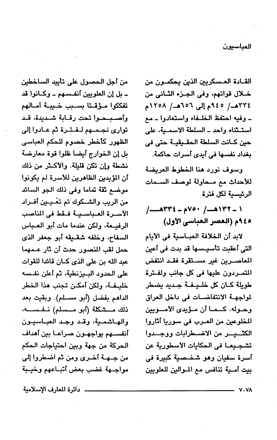 القادة العسكريين الذين يحكمون من خلال قواتهم، وفى الجزء الثانى من 334 هـ/ 945 م إلى 656 هـ/ 1258 م -وفيه احتفظ الخلفاء واستعادوا -مع استثناء واحد- السلطة الاسمية، على حين كانت السلطة الحقيقية حتى فى بغداد نفسها فى أيدى أسرات حاكمة.