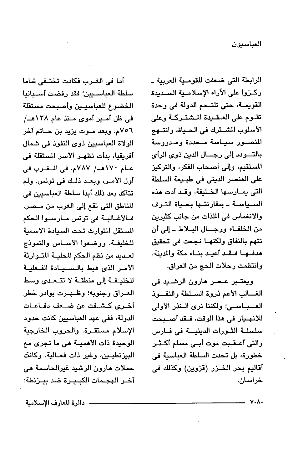 أما فى الغرب فكادت تختفى تماما سلطة العباسيين؛ فقد رفضت أسبانيا الخضوع للعباسيين وأصبحت مستقلة فى ظل أمير أموى منذ عام 138 هـ/ 756 م. وبعد موت يزيد بن حاتم آخر الولاة العباسيين ذوى النفوذ فى شمال أفريقيا، بدأت تظهر الأسر المستقلة فى عام 170 هـ/ 787 م، فى المغرب فى أول الأمر، وبعد ذلك فى تونس. ولم تتأكد بعد ذلك أبدا سلطة العباسيين فى المناطق التى تقع إلى الغرب من مصر. فالأغالبة فى تونس مارسوا الحكم المستقل المتوارث تحت السيادة الاسمية للخليفة، ووضعوا الأساس والنموذج لعديد من نظم الحكم المحلية المتوارثة الأمر الذى هبط بالسيادة الفعلية للخليفة إلى منطقة لا تتعدى وسط العراق وجنوبه؛ وظهرت بوادر خطر أخرى كشفت عن ضعف دفاعات الدولة، ففى عهد العباسيين كانت حدود الإسلام مستقرة. والحروب الخارجية الوحيدة ذات الأهمية هى ما تجرى مع البيزنطيين، وغير ذات فعالية. وكانت حملات هارون الرشيد غير الحاسمة هى آخر الهجمات الكبيرة ضد بيزنطة؛