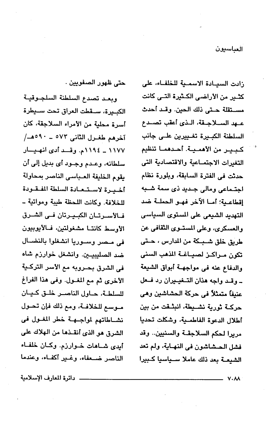 زادت السيادة الاسمية للخلفاء، على كثير من الأراضى الكثيرة التى كانت مستقلة حتى ذلك الحين. وقد أحدث عهد السلاجقة، الذى أعقب تصدع السلطنة الكبيرة تغييرين على جانب كبير من الأهمية. أحدهما تنظيم التغيرات الاجتماعية والاقتصادية التى حدثت فى الفترة السابقة، وبلورة نظام اجتماعى ومالى جديد ذى سمة شبه إقطاعية؛ أما الآخر فهو الحملة ضد التهديد الشيعى على المستوى السياسى والعسكرى، وعلى المستوى الثقافى عن طريق خلق شبكة من المدارس، حتى تكون مراكز لصياغة المذهب السنى والدفاع عنه فى مواجهة أبواق الشيعة -وقد واجه هذان التغييران رد فعل عنيفًا متمثلًا فى حركة الحشاشين وهى حركة ثورية نشيطة، انبثقت من بين أطلال الدعوة الفاطمية، وشكلت تحديا مريرا لحكم السلاجقة والسنيين. . وقد فشل الحشاشون فى النهاية، ولم تعد الشيعة بعد ذلك عاملا سياسيا كبيرا حتى ظهور الصفويين.