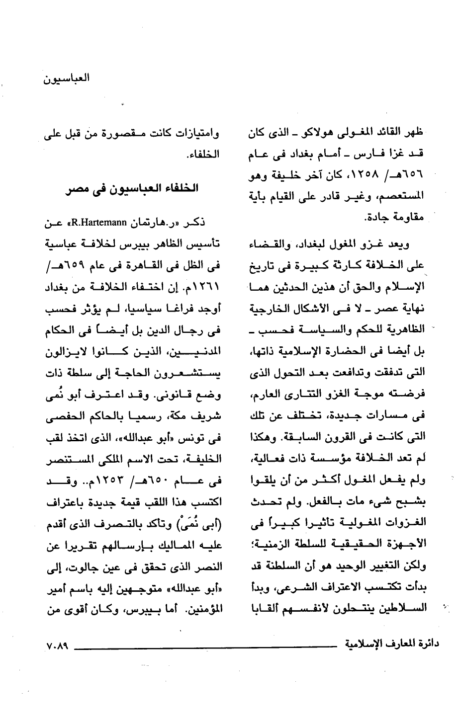 ذكر "ر. هارتمان R.Hartemann" عن تأسيس الظاهر بيبرس لخلافة عباسية فى الظل فى القاهرة فى عام 659 هـ/ 1261 م. إن اختفاء الخلافة من بغداد أوجد فراغا سياسيا، لم يؤثر فحسب فى رجال الدين بل أيضًا فى الحكام المدنيين، الذين كانوا لا يزالون يستشعرون الحاجة إلى سلطة ذات وضع قانونى. وقد اعترف أبو نص شريف مكة، رسميا بالحاكم الحفصى فى تونس "أبو عبد اللَّه"، الذى اتخذ لقب الخليفة، تحت الاسم الملكى المستنصر فى 650 هـ/ 1253 م. . وقد اكتسب هذا اللقب قيمة جديدة باعتراف (أبى نُمَىْ) وتأكد بالتصرف الذى أقدم عليه المماليك بإرسالهم تقريرا عن النصر الذى تحقق فى عين جالوت، إلى "أبو عبد اللَّه" متوجهين إليه باسم أمير المؤمنين. أما بيبرس، وكان أقوى من