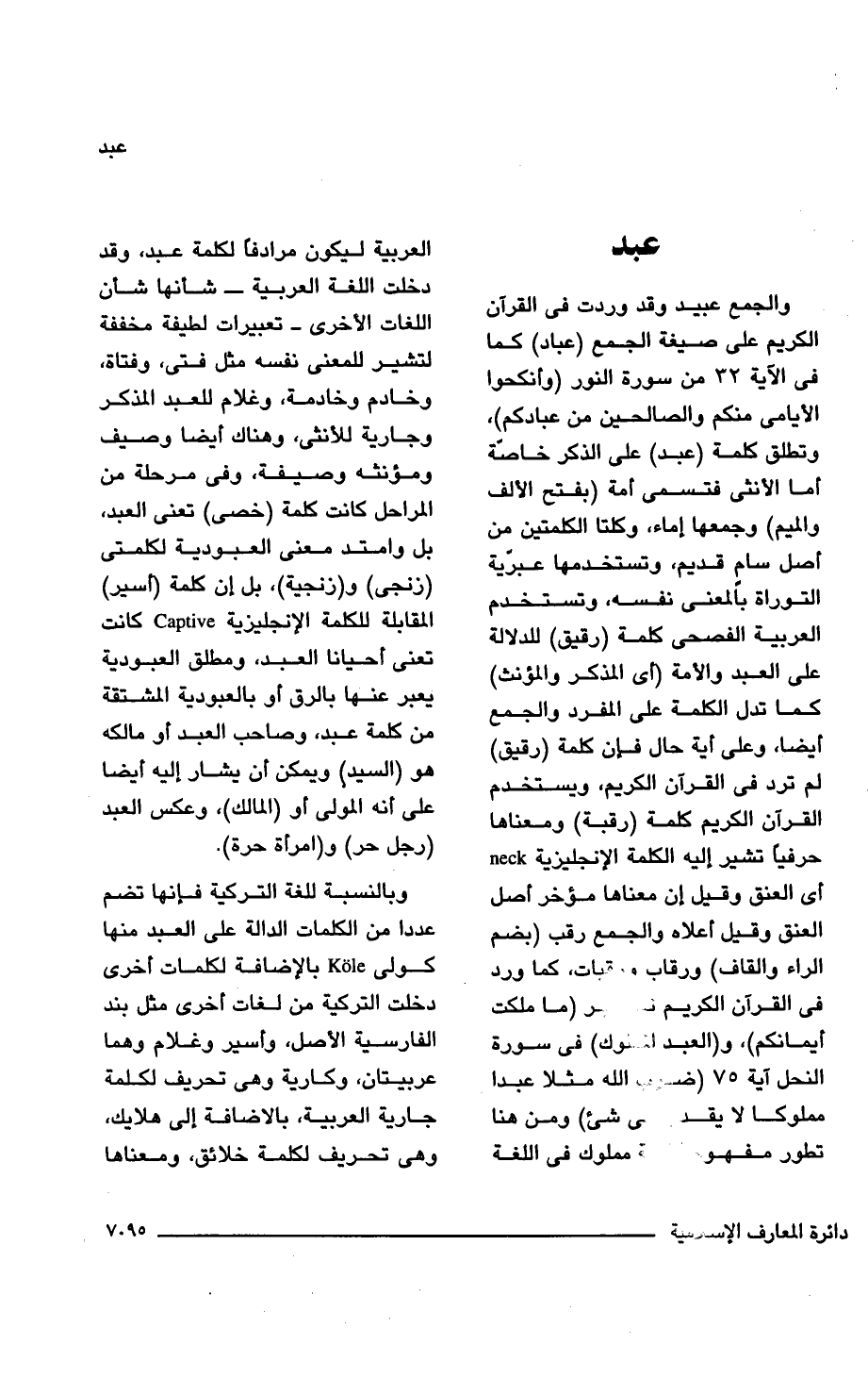 والجمع عبيد وقد وردت فى القرآن الكريم على صيغة الجمع (عباد) كما فى الآية 32 من سورة النور {وَأَنْكِحُوا الْأَيَامَى مِنْكُمْ وَالصَّالِحِينَ مِنْ عِبَادِكُمْ}، وتطلق كلمة (عبد) على الذكر خاصّة أما الأنثى فتسمى أمة (بفتح الألف والميم) وجمعها إماء، وكلتا الكلمتين من أصل سامٍ قديم، وتستخدمها عبرية التوراة بالمعنى نفسه، وتستخدم العربية الفصحى كلمة (رقيق) للدلالة على العبد والأمة أى (المذكر والمؤنث) كما تدل الكلمة على المفرد والجمع أيضا، وعلى أية حال فإن كلمة (رقيق) لم ترد فى القرآن الكريم، ويستخدم القرآن الكريم كلمة (رقبة) ومعناها حرفيًا تشير إليه الكلمة الإنجليزية neck أى العنق وقيل إن معناها مؤخر أصل العنق وقيل أعلاه والجمع رقب (بضم الراء والقاف) ورقاب ورقبات، كما ورد فى القرآن الكريم [. . . . .] (*) {مَا مَلَكَتْ أَيْمَانُكُمْ}، و (العبد المملوك) فى سورة النحل آية 75 {ضَرَبَ اللَّهُ مَثَلًا عَبْدًا مَمْلُوكًا لَا يَقْدِرُ عَلَى شَيْءٍ} ومن هنا تطور مفهوم كلمة مملوك فى اللغة العربية ليكون مرادفًا لكلمة عبد، وقد دخلت اللغة العربية -شأنها شأن اللغات الأخرى- تعبيرات لطيفة مخففة لتشير للمعنى نفسه مثل فتى، وفتاة، وخادم وخادمة، وغلام للعبد المذكر وجارية للأنثى، وهناك أيضا وصيف ومؤنثه وصيفة، وفى مرحلة من المراحل كانت كلمة (خصى) تعنى العبد، بل وامتد معنى العبودية لكلمتى (زنجى) و (زنجية)، بل إن كلمة (أسير) المقابلة للكلمة الانجليزية Captive كانت تعنى أحيانا العبد، ومطلق العبودية يعبر عنها بالرق أو بالعبودية المشتقة من كلمة عبد، وصاحب العبد أو مالكه هو (السيد) ويمكن أن يشار إليه أيضا على أنه المولى أو (المالك)، وعكس العبد (رجل حر) و (امرأة حرة).
