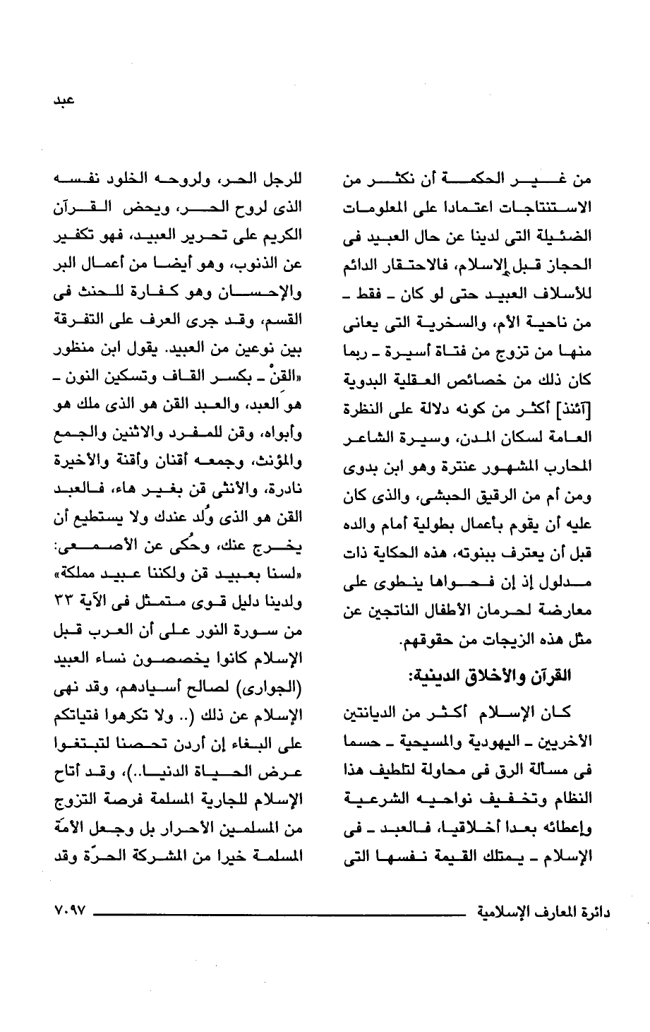 كان الإسلام أكثر من الديانتين الأخريين -اليهودية والمسيحية- حسما فى مسألة الرق فى محاولة لتلطيف هذا النظام وتخفيف نواحيه الشرعية وإعطائه بعدا أخلاقيا، فالعبد -فى الإسلام- يمتلك القيمة نفسها التى للرجل الحر، ولروحه الخلود نفسه الذى لروح الحر، ويحض القرآن الكريم على تحرير العبيد، فهو تكفير عن الذنوب، وهو أيضا من أعمال البر والإحسان وهو كفارة للحنث فى القسم، وقد جرى العرف على التفرقة بين نوعين من العبيد. يقول ابن منظور "القِنْ -بكسر القاف وتسكين النون- هو العبد، والعبد القن هو الذى ملك هو وأبواه، وقن للمفرد والاثنين والجمع والمؤنث، وجمعه أقنان وأقنة والأخيرة نادرة، والأنثى قن بغير هاء، فالعبد القن هو الذى وُلد عندك ولا يستطيع أن يخرج عنك، وحُكى عن الأصمعى: "لسنا بعبيد قن ولكننا عبيد مملكة" ولدينا دليل قوى متمثل فى الآية 33 من سورة النور على أن العرب قبل الإسلام كانوا يخصصون نساء العبيد (الجوارى) لصالح أسيادهم، وقد نهى الإسلام عن ذلك {وَلَا تُكْرِهُوا فَتَيَاتِكُمْ عَلَى الْبِغَاءِ إِنْ أَرَدْنَ تَحَصُّنًا لِتَبْتَغُوا عَرَضَ الْحَيَاةِ الدُّنْيَا}، وقد أتاح الإسلام للجارية المسلمة فرصة التزوج من المسلمين الأحرار بل وجعل الأمة المسلمة خيرا من المشركة الحرّة وقد