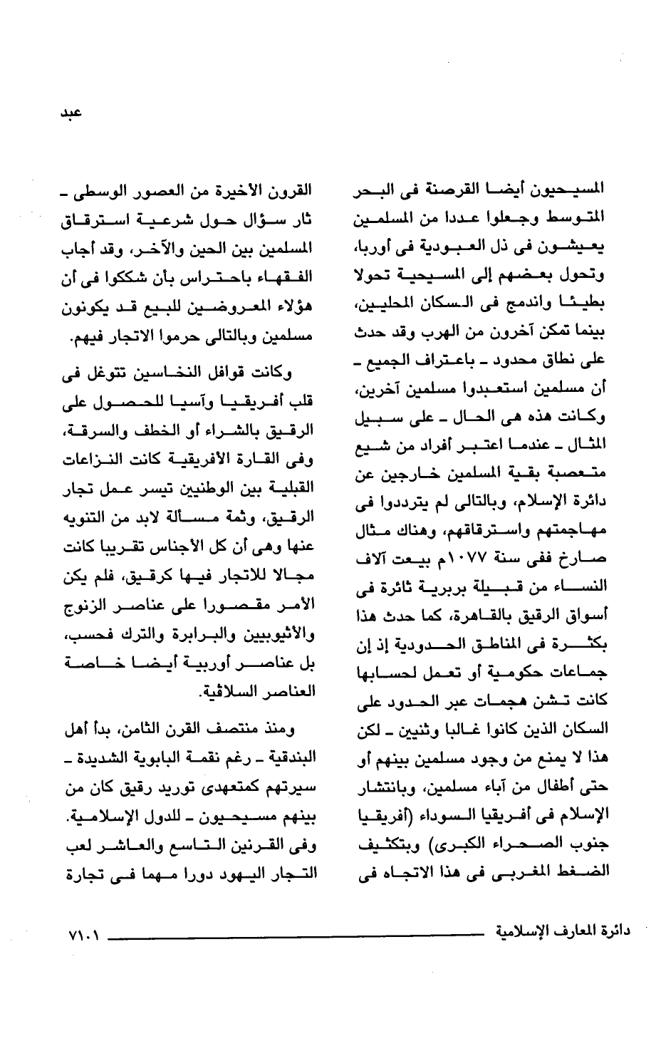 المسيحيون أيضا القرصنة فى البحر المتوسط وجعلوا عددا من المسلمين يعيشون فى ذل العبودية فى أوربا، وتحول بعضهم إلى المسيحية تحولا بطيئا واندمج فى السكان المحليين، بينما تمكن آخرون من الهرب وقد حدث على نطاق محدود -باعتراف الجميع- أن مسلمين استعبدوا مسلمين آخرين، وكانت هذه هى الحال -على سبيل المثال- عندما اعتبر أفراد من شيع متعصبة بقية المسلمين خارجين عن دائرة الإسلام، وبالتالى لم يترددوا فى مهاجمتهم واسترقاقهم، وهناك مثال صارخ ففى سنة 1077 م بيعت آلاف النساء من قبيلة بربرية ثائرة فى أسواق الرقيق بالقاهرة، كما حدث هذا بكثرة فى المناطق الحدودية إذ إن جماعات حكومية أو تعمل لحسابها كانت تشن هجمات عبر الحدود على السكان الذين كانوا غالبا وثنيين -لكن هذا لا يمنع من وجود مسلمين بينهم أو حتى أطفال من آباء مسلمين، وبانتشار الإسلام فى أفريقيا السوداء (أفريقيا جنوب الصحراء الكبرى) وبتكثيف الضغط المغربى فى هذا الاتجاه فى القرون الأخيرة من العصور الوسطى- ثار سؤال حول شرعية استرقاق المسلمين بين الحين والآخر، وقد أجاب الفقهاء باحتراس بأن شككوا فى أن هؤلاء المعروضين للبيع قد يكونون مسلمين وبالتالى حرموا الاتجار فيهم.