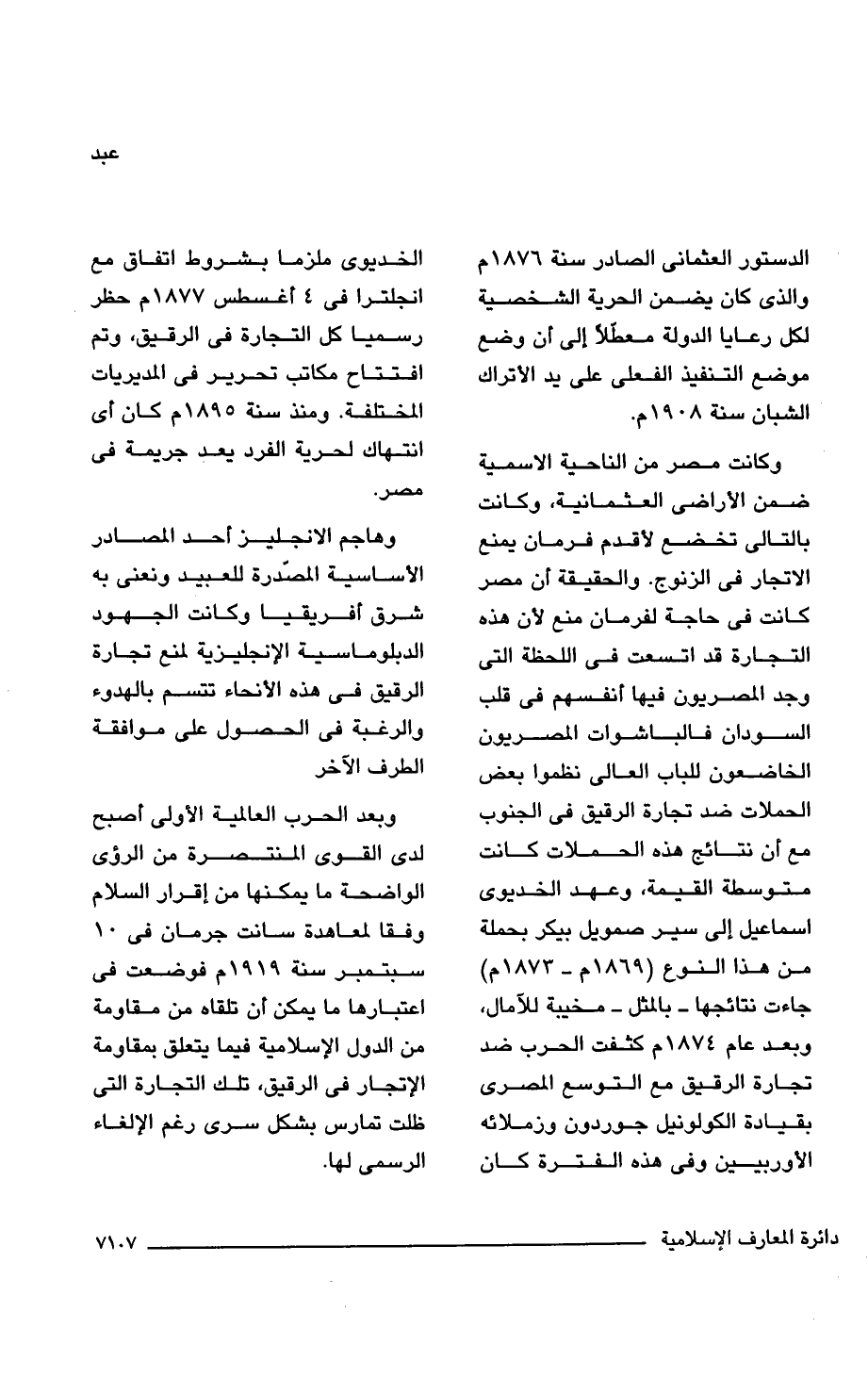 وكانت مصر من الناحية الاسمية ضمن الأراضى العثمانية، وكانت بالتالى تخضع لأقدم فرمان يمنع الاتجار فى الزنوج. والحقيقة أن مصر كانت فى حاجة لفرمان منع لأن هذه التجارة قد اتسعت فى اللحظة التى وجد المصريون فيها أنفسهم فى قلب السودان فالباشوات المصريون الخاضعون للباب العالى نظموا بعض الحملات ضد تجارة الرقيق فى الجنوب مع أن نتائج هذه الحملات كانت متوسطة القيمة، وعهد الخديوى إسماعيل إلى سير صمويل بيكر بحملة من هذا النوع (1869 م - 1873 م) جاءت نتائجها -بالمثل- مخيبة للآمال، وبعد عام 1874 م كثفت الحرب ضد تجارة الرقيق مع التوسع المصرى بقيادة الكولونيل جوردون وزملائه الأوربيين وفى هذه الفترة كان الخديوى ملزما بشروط اتفاق مع انجلترا فى 4 أغسطس 1877 م حظر رسميا كل التجارة فى الرقيق، وتم افتتاح مكاتب تحرير فى المديريات المختلفة. ومنذ سنة 1895 م كان أى انتهاك لحرية الفرد يعد جريمة فى مصر.
