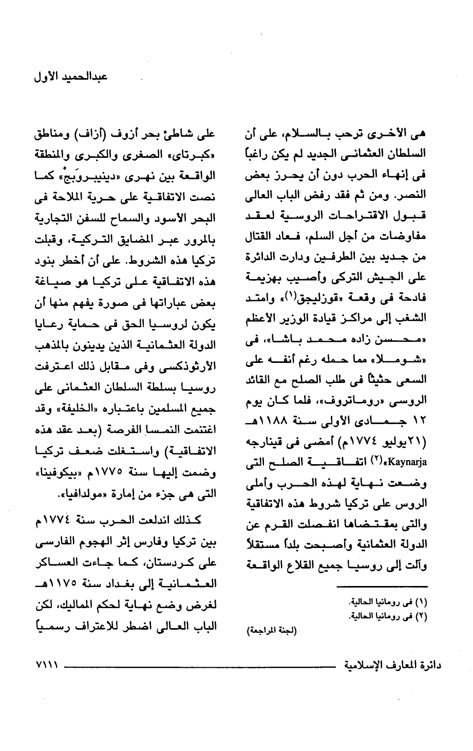 هى الأخرى ترحب بالسلام، على أن السلطان العثمانى الجديد لم يكن راغبًا فى إنهاء الحرب دون أن يحرز بعض النصر. ومن ثم فقد رفض الباب العالى قبول الاقتراحات الروسية لعقد مفاوضات من أجل السلم، فعاد القتال من جديد بين الطرفين ودارت الدائرة على الجيش التركى وأصيب بهزيمة فادحة فى وقعة "قوزليجق (¬1) " وامتد الشغب إلى مراكز قيادة الوزير الأعظم "محسن زاده محمد باشا"، فى "شوملا" مما حمله رغم أنفه على السعى حثيثًا فى طلب الصلح مع القائد الروسى "روماتروف"، فلما كان يوم 12 جمادى الأولى سنة 1188 هـ (21 يوليو 1774 م) أمضى فى قينارجه Kaynarja (¬2) اتفاقية الصلح التى وضعت نهاية لهذه الحرب وأملى الروس على تركيا شروط هذه الاتفاقية والتى بمقتضاها انفصلت القرم عن الدولة العثمانية وأصبحت بلدًا مستقلًا وآلت إلى روسيا جميع القلاع الواقعة على شاطئ بحر أزوف (أزاف) ومناطق "كبرتاى" الصغرى والكبرى والمنطقة الواقعة بين نهرى "دينيبروَبجْ" كما نصت الاتفاقية على حرية الملاحة فى البحر الأسود والسماح للسفن التجارية بالمرور عبر المضايق التركية، وقبلت تركيا هذه الشروط. على أن أخطر بنود هذه الاتفاقية على تركيا هو صياغة بعض عباراتها فى صورة يفهم منها أن يكون لروسيا الحق فى حماية رعايا الدولة العثمانية الذين يدينون بالمذهب الأرثوذكسى وفى مقابل ذلك اعترفت روسيا بسلطة السلطان العثمانى على جميع المسلمين باعتباره "الخليفة" وقد اغتنمت النمسا الفرصة (بعد عقد هذه الاتفاقية) واستغلت ضعف تركيا وضمت إليها سنة 1775 م "بيكوفينا" التى هى جزء من إمارة "مولدافيا".