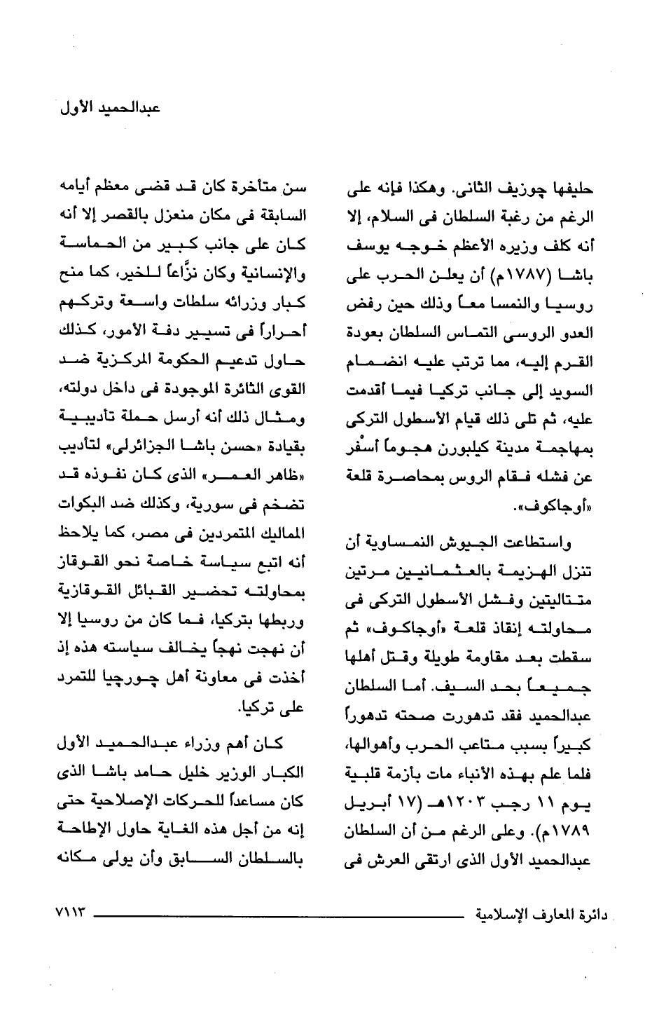 واستطاعت الجيوش النمساوية أن تنزل الهزيمة بالعثمانيين مرتين متتاليتين وفشل الأسطول التركى فى محاولته إنقاذ قلعة "أوجاكوف" ثم سقطت بعد مقاومة طويلة وقتل أهلها جميعًا بحد السيف. أما السلطان عبد الحميد فقد تدهورت صحته تدهورًا كبيرًا بسبب متاعب الحرب وأهوالها، فلما علم بهذه الأنباء مات بأزمة قلبية يوم 11 رجب 1203 هـ (17 أبريل 1789 م). وعلى الرغم من أن السلطان عبد الحميد الأول الذى ارتقى العرش فى سن متأخرة كان قد قضى معظم أيامه السابقة فى مكان منعزل بالقصر إلا أنه كان على جانب كبير من الحماسة والإنسانية وكان نزَّاعًا للخير، كما منح كبار وزرائه سلطات واسعة وتركهم أحرارًا فى تسيير دفة الأمور، كذلك حاول تدعيم الحكومة المركزية ضد القوى الثائرة الموجودة فى داخل دولته، ومثال ذلك أنه أرسل حملة تأديبية بقيادة "حسن باشا الجزائرلى" لتأديب "ظاهر العمر" الذى كان نفوذه قد تضخم فى سورية، وكذلك ضد البكوات المماليك المتمردين فى مصر، كما يلاحظ أنه اتبع سياسة خاصة نحو القوقاز بمحاولته تحضير القبائل القوقازية وربطها بتركيا، فما كان من روسيا إلا أن نهجت نهجا يخالف سياسته هذه إذ أخذت فى معاونة أهل جورجيا للتمرد على تركيا.