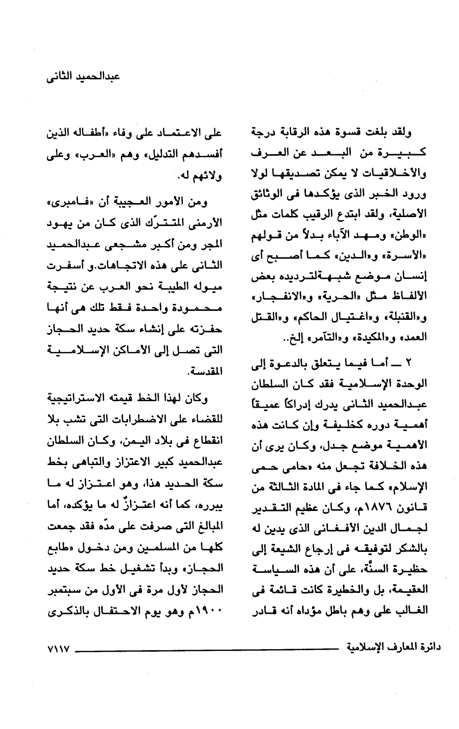 2 - أما فيما يتعلق بالدعوة إلى الوحدة الإسلامية فقد كان السلطان عبد الحميد الثانى يدرك إدراكًا عميقًا أهمية دوره كخليفة وإن كانت هذه الأهمية موضع جدل، وكان يرى أن هذه الخلافة تجعل منه "حامى حمى الإسلام" كما جاء فى المادة الثالثة من قانون 1876 م، وكان عظيم التقدير لجمال الدين الأفغانى الذى يدين له بالشكر لتوفيقه فى إرجاع الشيعة إلى حظيرة السنَّة، على أن هذه السياسة العقيمة، بل والخطيرة كانت قائمة فى الغالب على وهم باظل مؤداه أنه قادر على الاعتماد على وفاء "أطفاله الذين أفسدهم التدليل" وهم "العرب" وعلى ولائهم له.