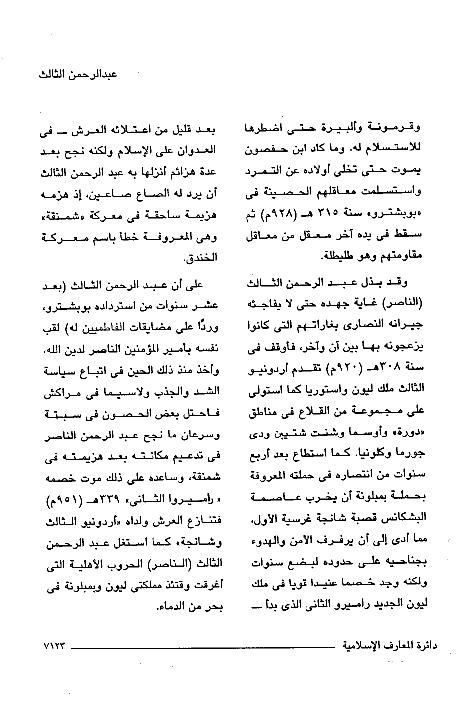 وقرمونة وألبيرة حتى اضطرها للاستسلام له. وما كاد ابن حفصون يموت حتى تخلى أولاده عن التمرد واستسلمت معاقلهم الحصينة فى "بوبشترو" سنة 315 هـ (928 م) ثم سقط فى يده آخر معقل من معاقل مقاومتهم وهو طليطلة.
