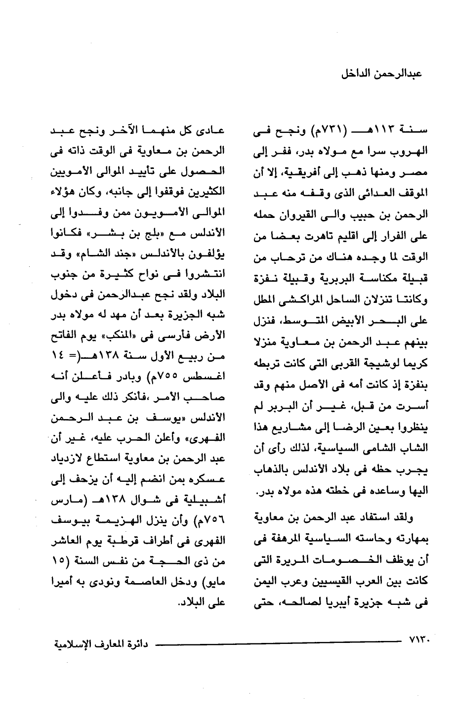 سنة 113 هـ (731 م) ونجح فى الهروب سرا مع مولاه بدر، ففر إلى مصر ومنها ذهب إلى أفريقية، إلا أن الموقف العدائى الذى وقفه منه عبد الرحمن بن حبيب والى القيروان حمله على الفرار إلى اقليم تاهرت بعضا من الوقت لما وجده هناك من ترحاب من قبيلة مكناسة البربرية وقبيلة نفزة وكانتا تنزلان الساحل المراكشى المطل على البحر الأبيض المتوسط، فنزل بينهم عبد الرحمن بن معاوية منزلا كريما لوشيجة القربى التى كانت تربطه بنفزة إذ كانت أمه فى الأصل منهم وقد أسرت من قبل، غير أن البربر لم ينظروا بعين الرضا إلى مشاريع هذا الشاب الشامى السياسية، لذلك رأى أن يجرب حظه فى بلاد الأندلس بالذهاب اليها وساعده فى خطته هذه مولاه بدر.